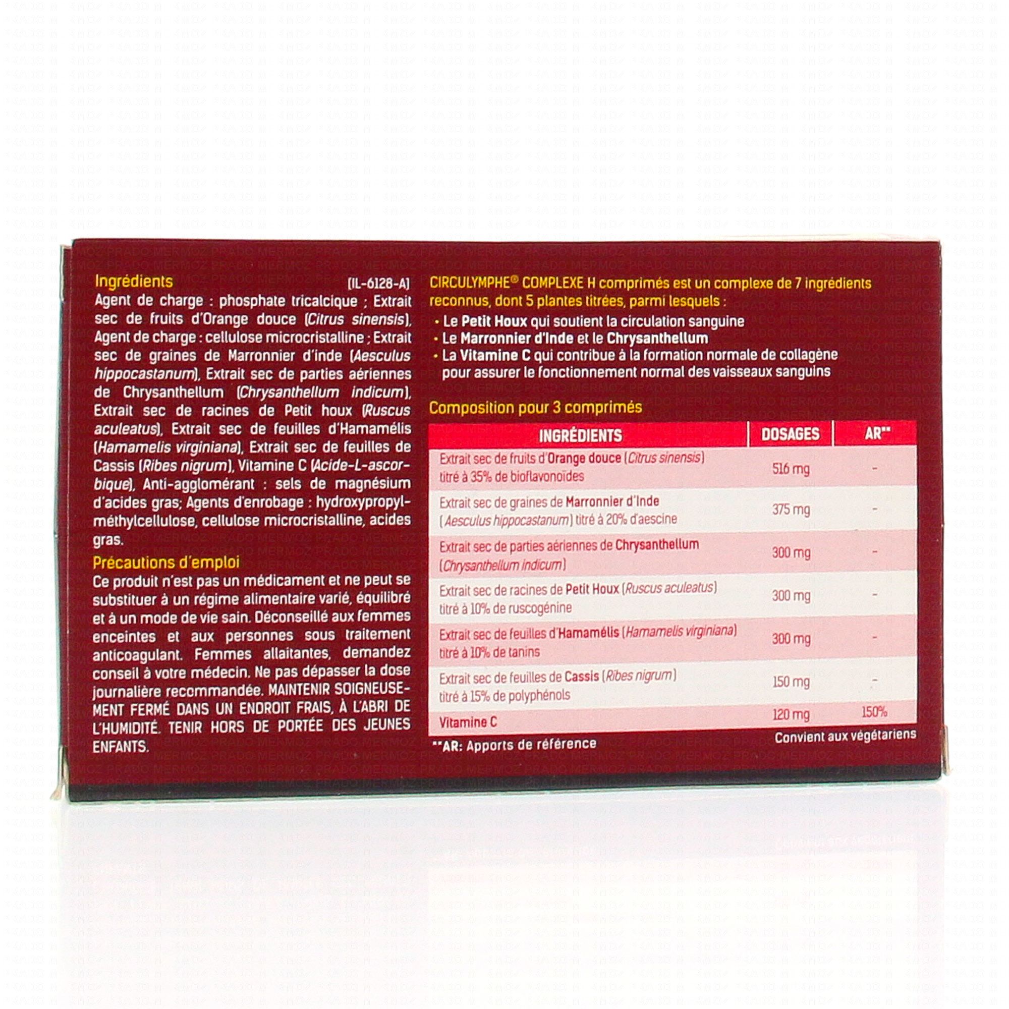 En stockIngrédients : Agent de charge : phosphate tricalcique ; Extrait sec de fruits d'Orange douce (Citrus sinensis), Agent de charge : cellulose microcristalline ; Extrait sec de graines de Marronier d'Inde (Aesculus hippocastanum), Extrait sec de parties aériennes de Chrysanthellum (Chrysanthellum indicum), Extrait sec de racines de Petit houx (Ruscus aculeatus), Extrait sec de feuilles d'Hamamélis (Hamamelis virginiana), Extrait sec de feuilles de Cassis (Ribes nigrum), Vitamine C (Acide-L-ascorbique), Anti-agglomérant : sels de magnésium d'acides gras ; Agents d'enrobage : hydroxypropylméthylcellulose, cellulose microcristalline, acides gras.