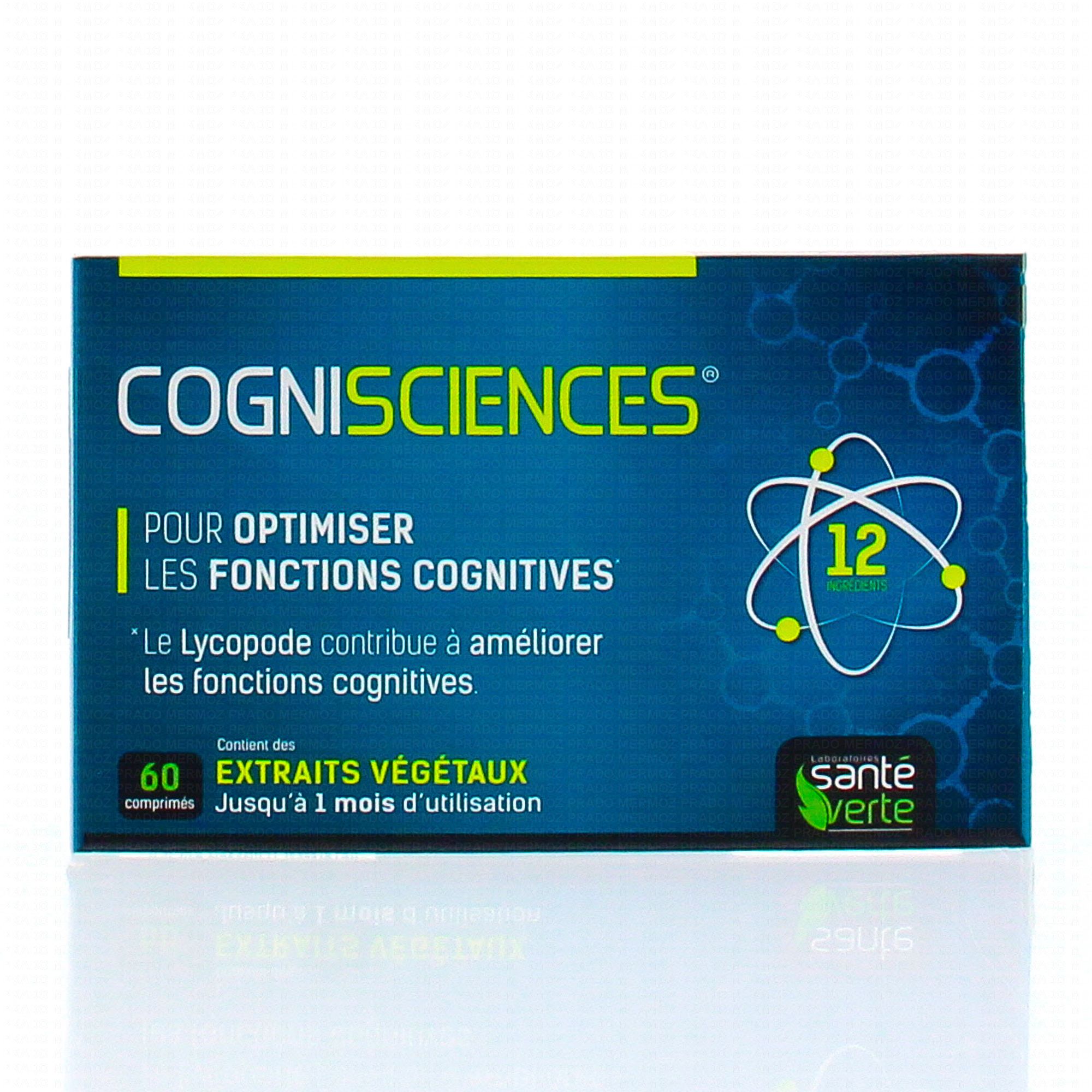 SANTÉ VERTE Cognisciences est un complément alimentaire qui contribue à maintenir une bonne fonction cognitive grâce à la présence de Ginko et de Lécithine. La Petite Pervenche et le Lycopodium serratum participent à stimuler l'activité intellectuelle et renforcer la mémoire, Le magnésium contribue au fonctionnement normale du système nerveux.