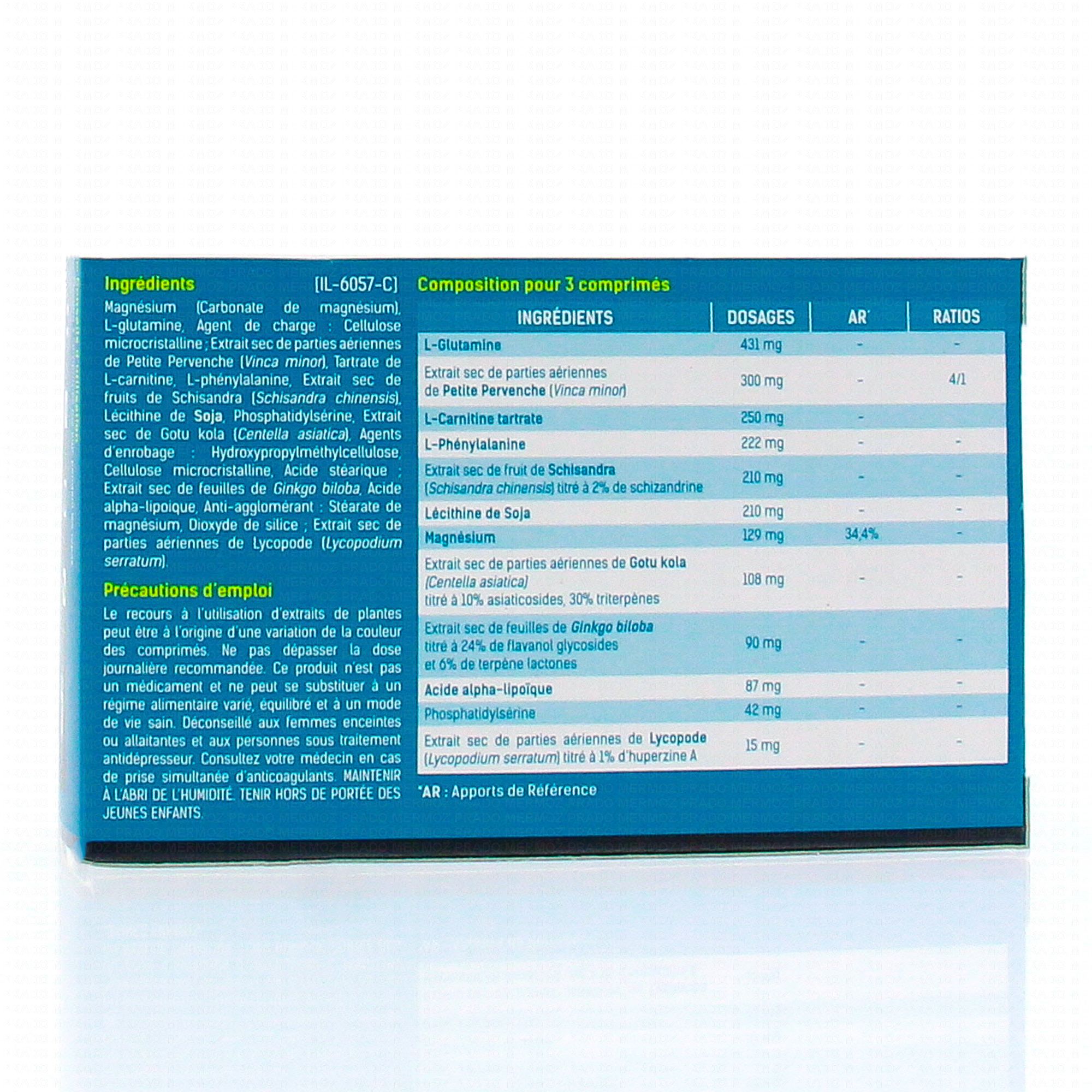 Ingrédients : Carbonate de magnésium, agent de charge : cellulose microcristalline : L-glutamine, lécithine de soja, extrait sec de petite pervenche (Vinca minor), L-carnitine tartrate, L-Phénylalanine, extrait sec de schisandra (Schisandra chinensis), extrait sec de Centella asiatica, Agents d'enrobage : hydroxypropylmethylcellulose, cellulose microcristalline, acide stéarique : extrait sec de Ginkgo biloba, acide alpha lipoique, anti-agglomérant : stéarate de magnésium, extrait sec de Lycopodium serratum.
