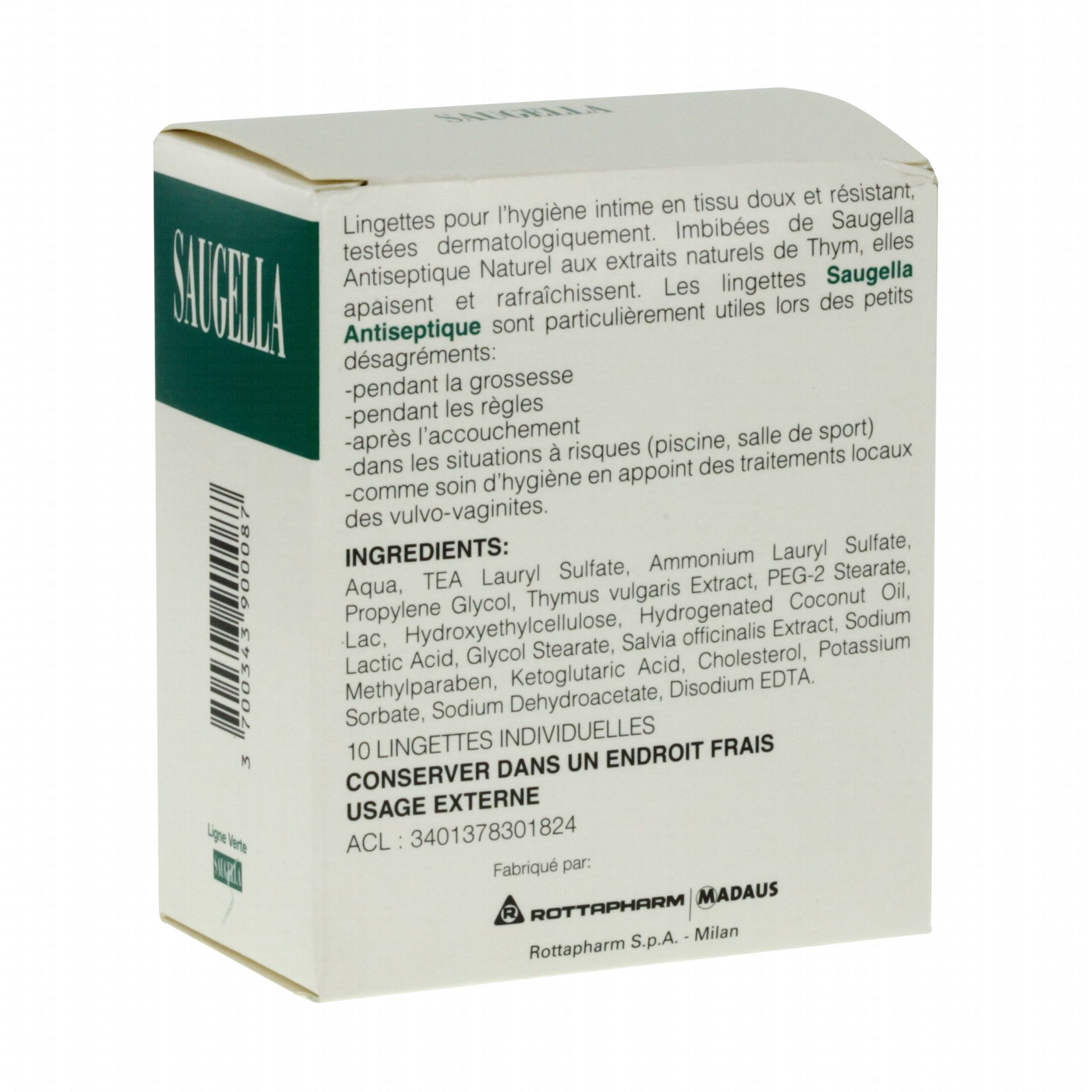 Imprégnées d'une solution à base d'extrait de thym aux vertus antibactériennes, les Lingettes Antiseptique Naturel de Saugella apaisent efficacement les démangeaisons. Elles contiennent également de l'extrait naturel de sauge qui calme les irritations. Antiseptique, rafraîchissante et adoucissante. Respecte l'équilibre physiologique des muqueuses et de la flore vaginale. Conditionnement : sachet individuel, étui carton.