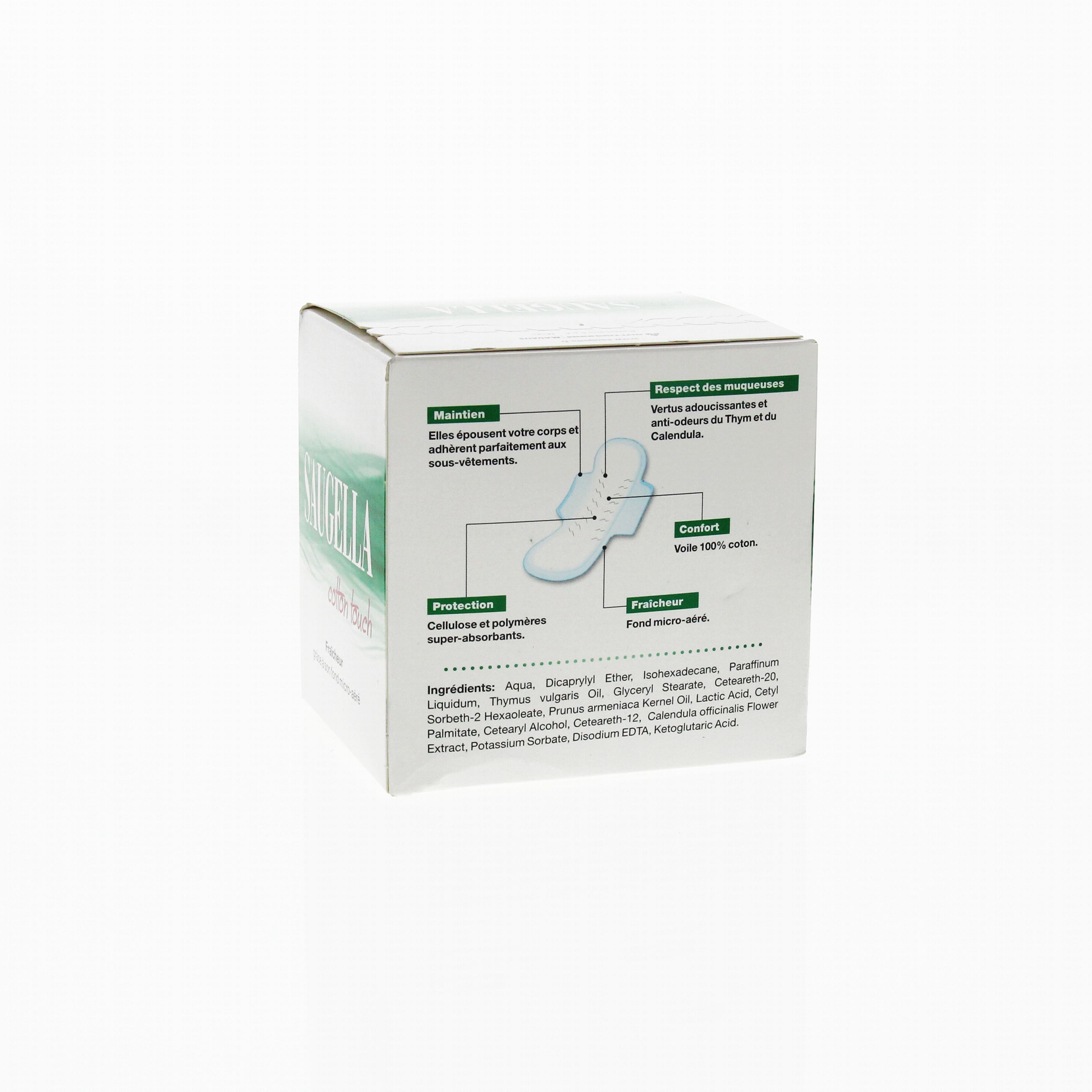 Equipées d'un voile en 100% coton, les serviettes Cotton Touch Jour de Saugella sont hypoallergéniques. Leur teneur en extraits naturel de calendula et de thym assure un confort optimal. Hypoallergénique, extrafine, adoucissante, antiodeur et adhésive. Constituée d'un fond microaéré, de cellulose et polymères superabsorbants et d'un voile coton. Munie d'ailettes latérales. Conditionnement : sous pochette individuelle, boîte carton.