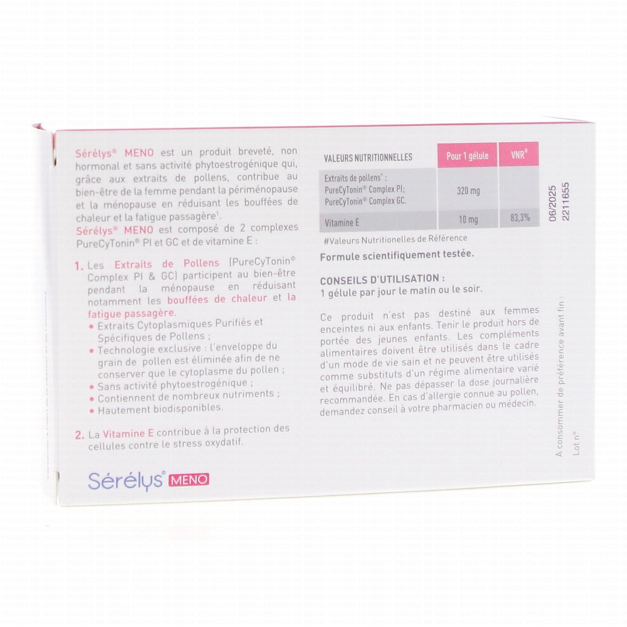 SERELY Meno désagrément de la (péri)-ménopause est un complément alimentaire qui contient un mélange d'extraits de pollens (PureCyTonin Complex PI & GC) qui participe au bien-être pendant la ménopause. La vitamine E aide à protéger les cellules contre le stress oxydatif.