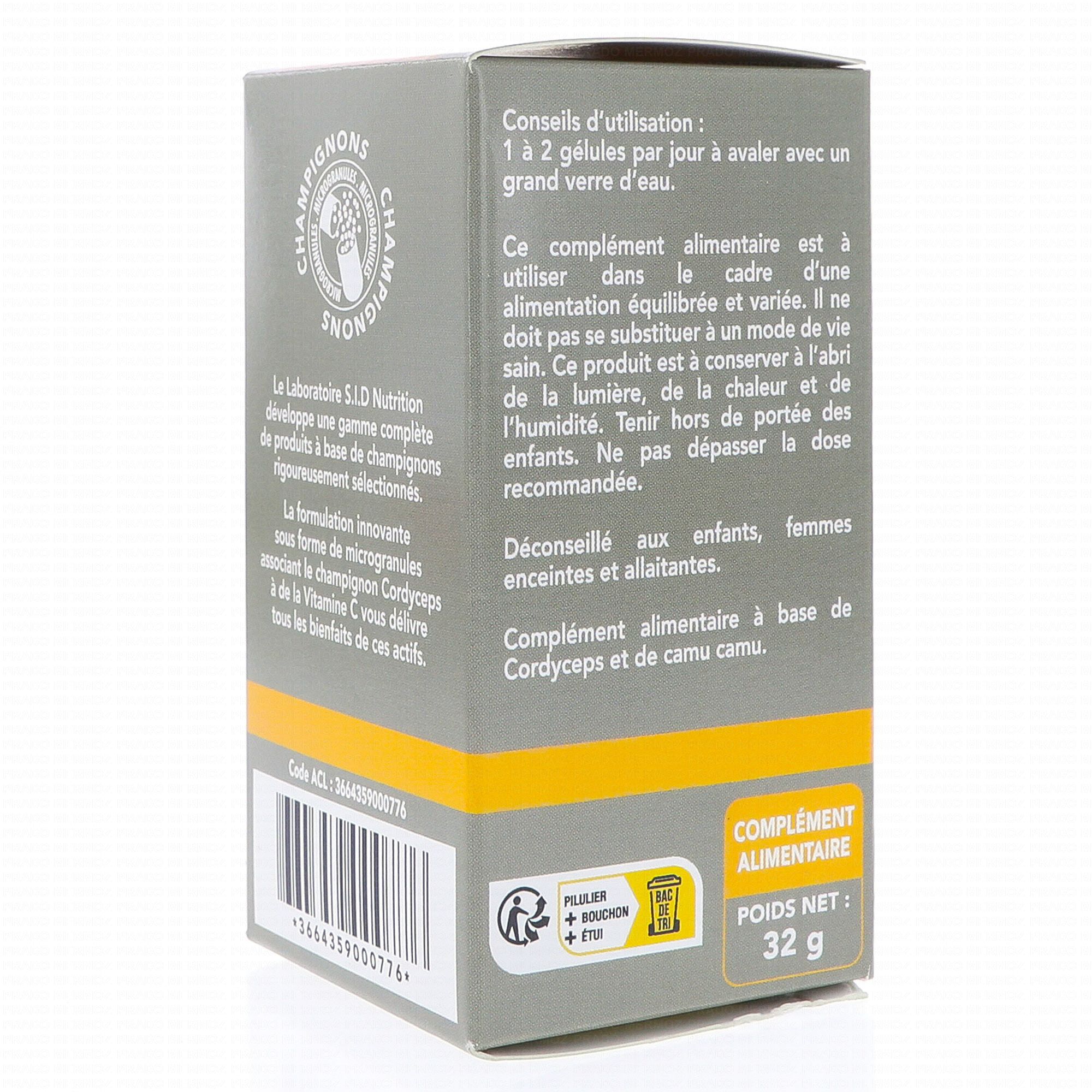 Pour 1 gélule : extrait sec de Cordyceps (300 mg) dont polysaccharides (60 mg) ; extrait sec de Camu Camu (25 mg) dont vitamine C (12,5 mg soit 15,62 % des apports de référence)