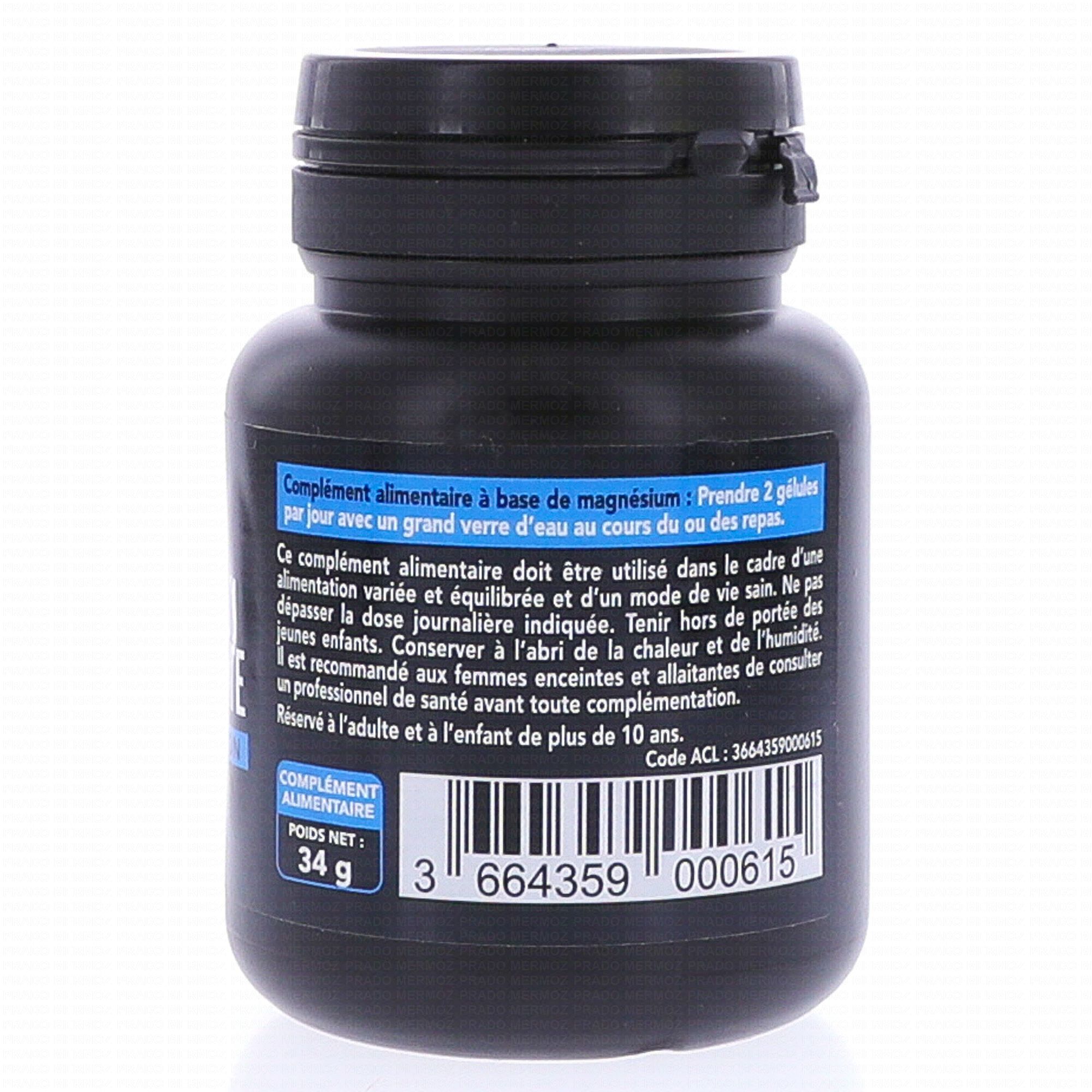 Pour 2 gélules : 1000 mg de Bisglycinate de Magnésium soit 200 mg d'élément Magnésium (53% des apports de référence)