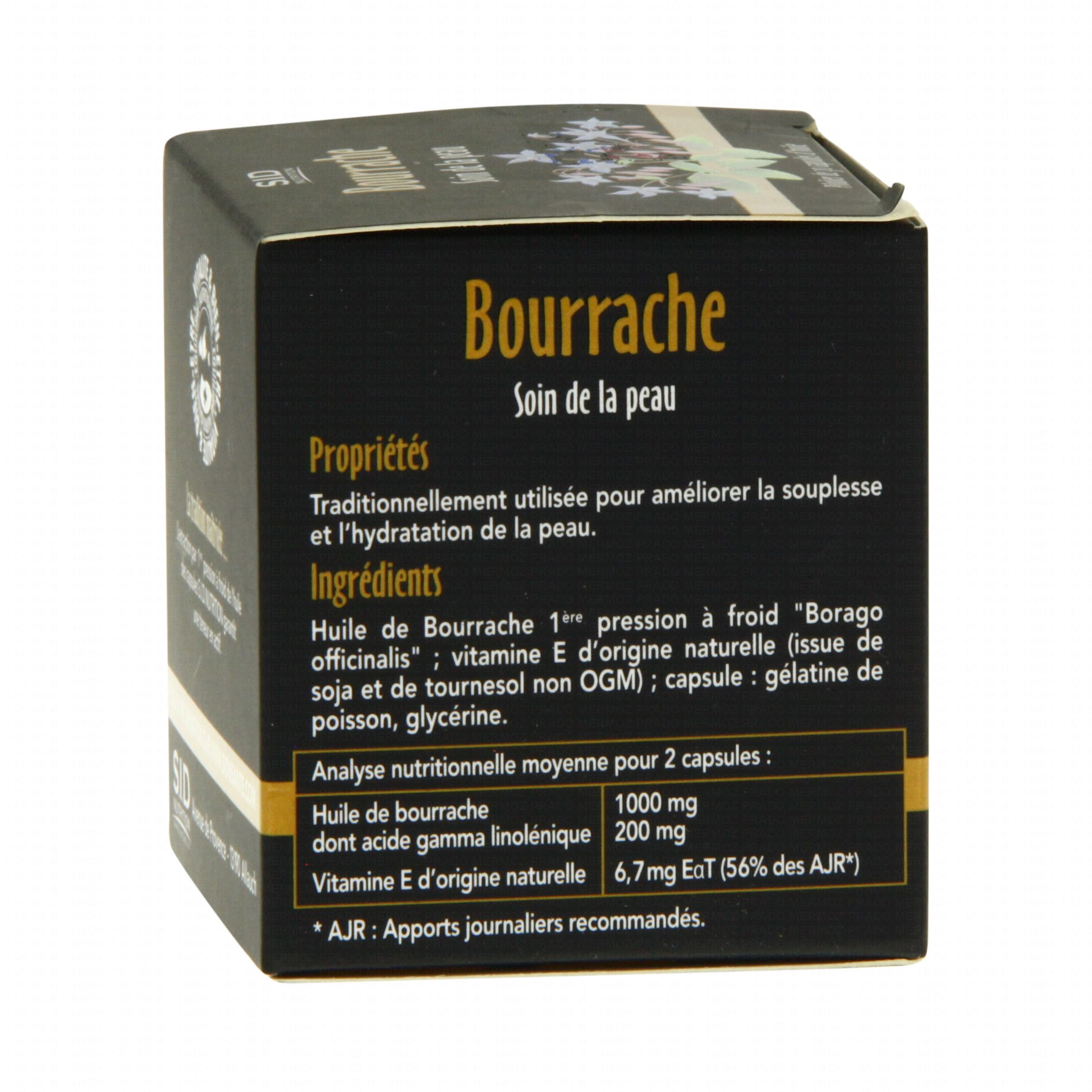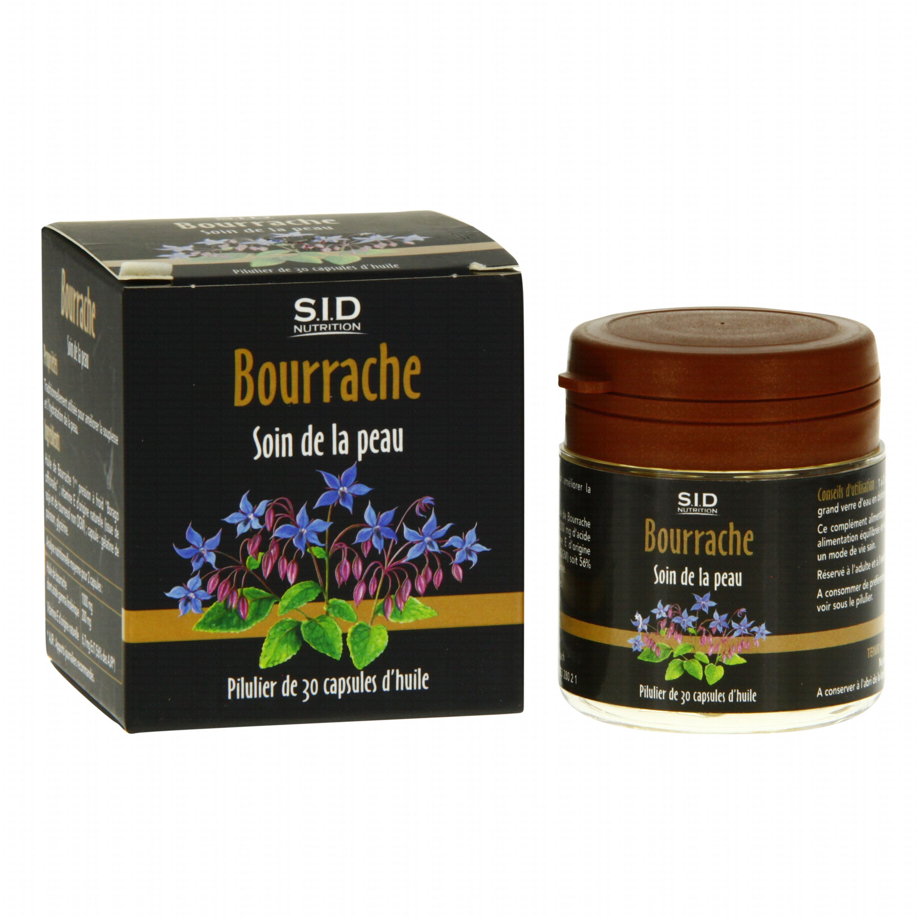 La bourrache, de la famille des borraginacées, est une plante dont on utilise l'huile pour améliorer la qualité de l'épiderme et traiter les problèmes de peaux comme l'eczéma, le psoriasis ou l'hydratation grâce aux acides gras polyinsaturés, principes actifs de la bourrache. Complément alimentaire, beauté de la peau.
