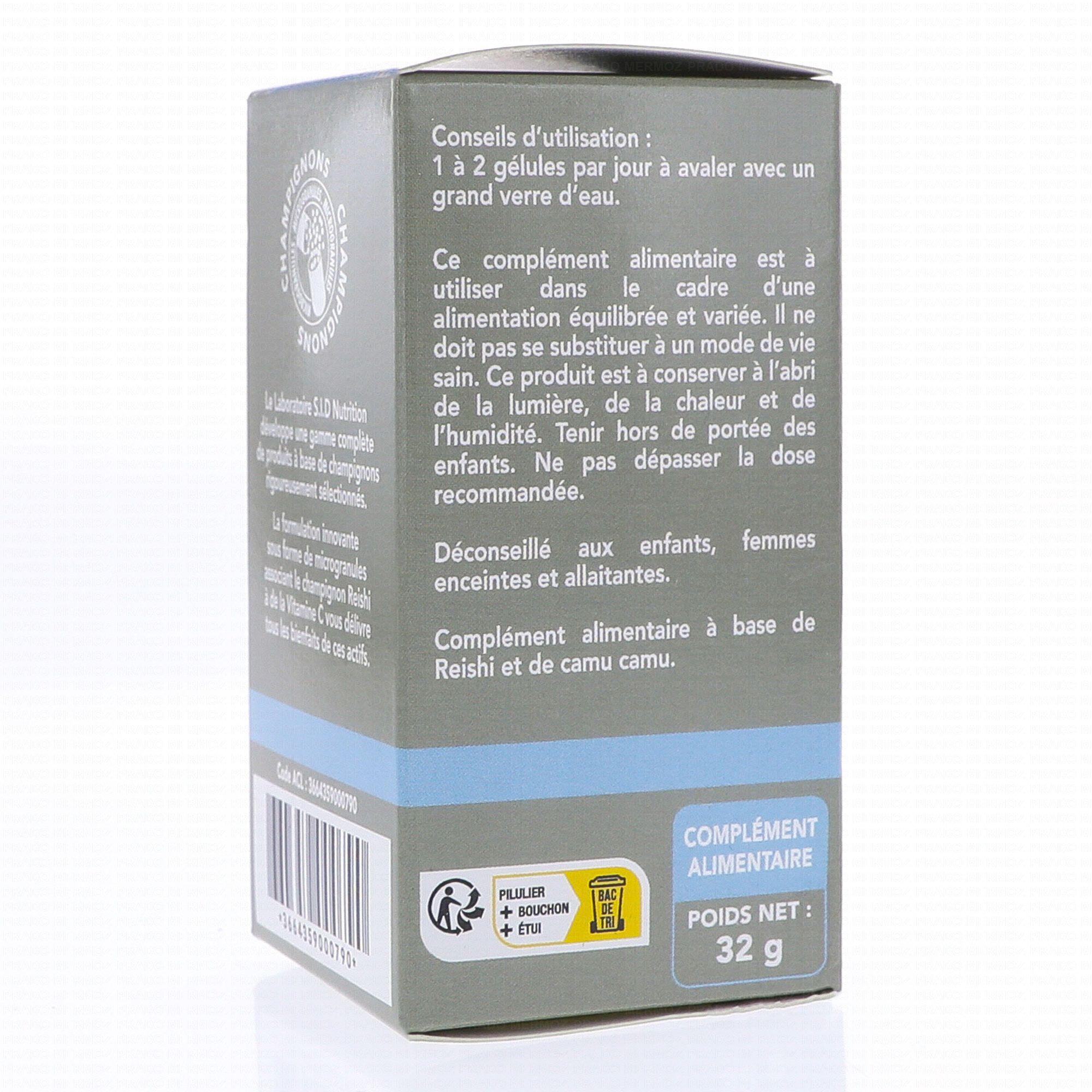 Pour 1 gélule : extrait sec de Reishi (300 mg) dont polysaccharides (90 mg) et bêta-glucanes (60 mg) ; extrait sec de Camu Camu (25 mg) dont vitamine C (12,5 mg soit 15,62 % des apports de référence)