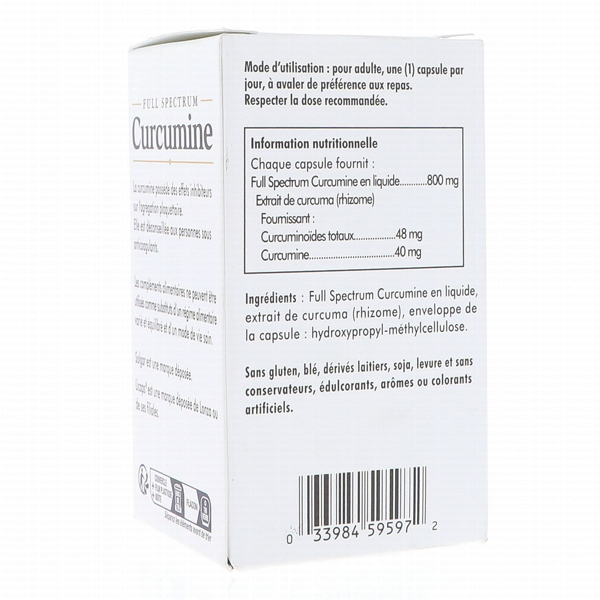 Full Spectrum curcumine (polysorbate 80 (émulsifiant), extrait de curcuma (Curcuma longa [rhizome]), Gélatine, Glycérine Végétale.