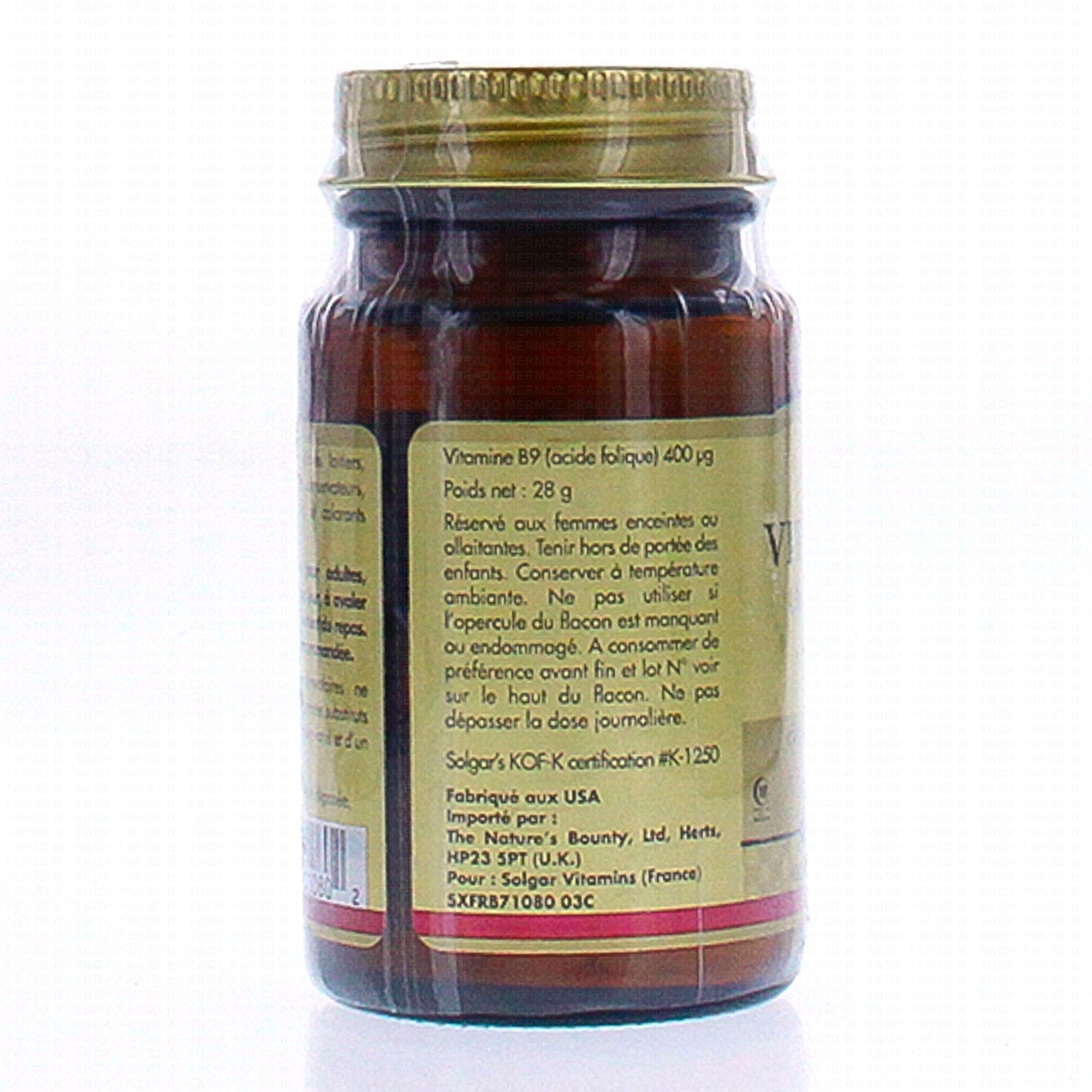SOLGAR Vitamine B9 400 µm x100 comprimés contient les éléments suivants :