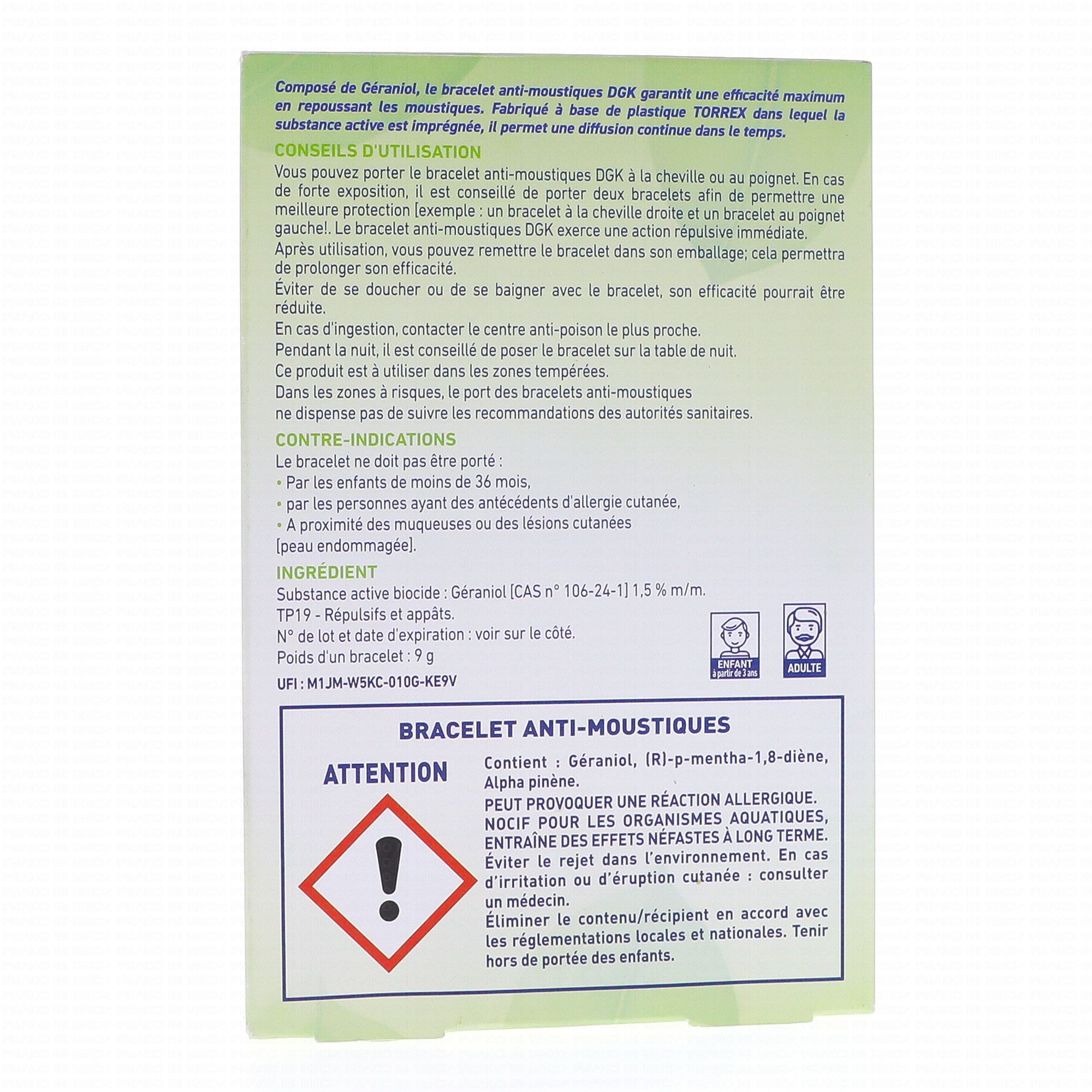 Vous pouvez porter le bracelet anti-moustiques DGK à la cheville ou au poignet. En cas de forte exposition, il est conseillé de porter deux bracelets afin de permettre une meilleure protection (un bracelet à la cheville droite et un bracelet au poignet gauche.)