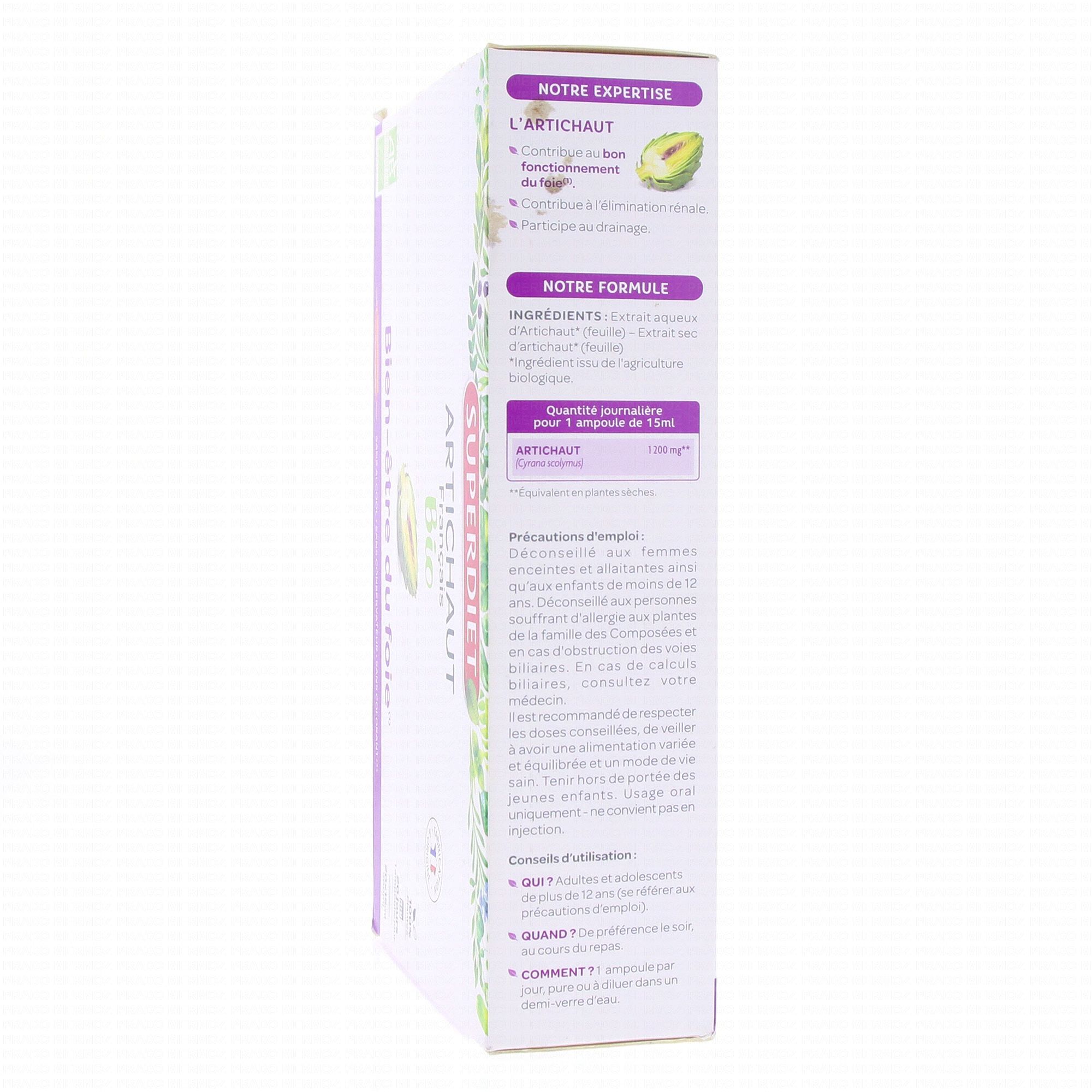 Composé essentiellement d'artichaut, élément qui favorise l'élimination d'eau et aide à purifier le métabolisme des toxines, Super Diet d'artichaut Bio est vivement conseillé lors de changement de saison ou d'alimentation afin de vous aider à éliminer et drainer les déchets de votre organisme et vous offrir un confort hépatique. Agriculture biologique. Sans alcool, sans conservateur. Conditionnement : ampoule autocassable de 15 ml sous étui carton. traditionnellement utilisée pour faciliter les fonctions d'élimination de l'organisme, insuffisance hépatique, constipation.