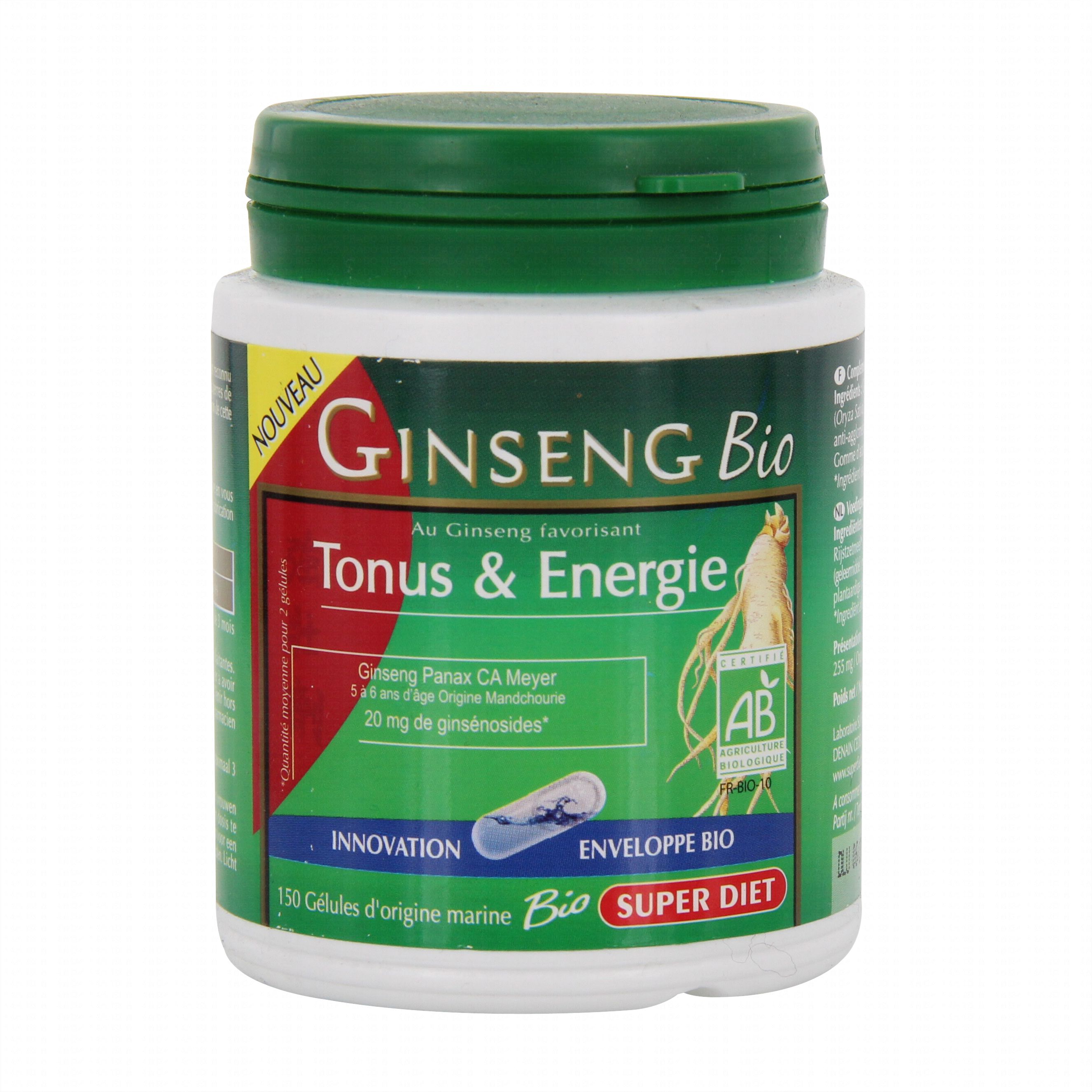 SUPER DIET Ginseng bio pilulier 150 gélules contient les éléments suivants :