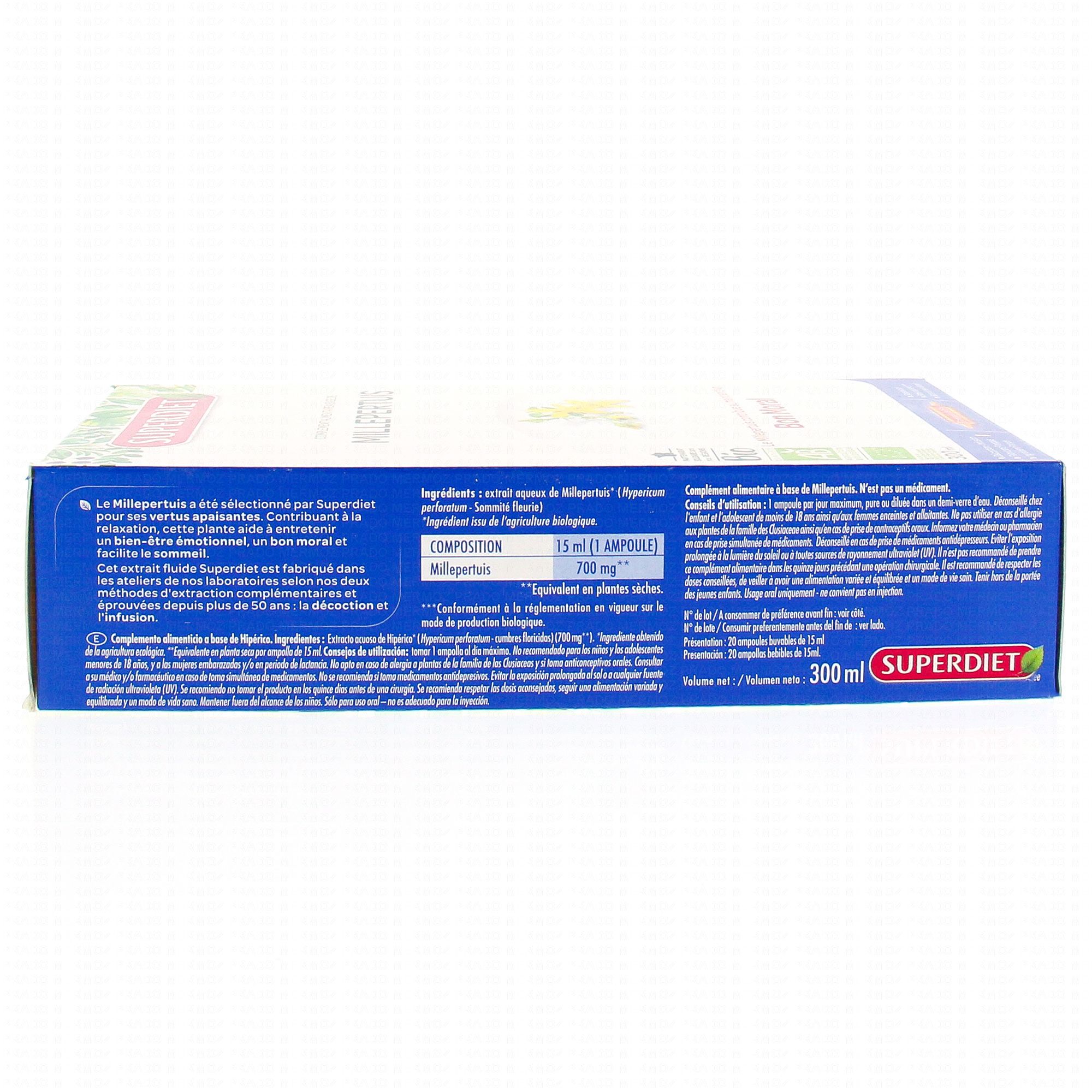 SUPER DIET Millepertuis bien-être 20 ampoules contient les éléments suivants :