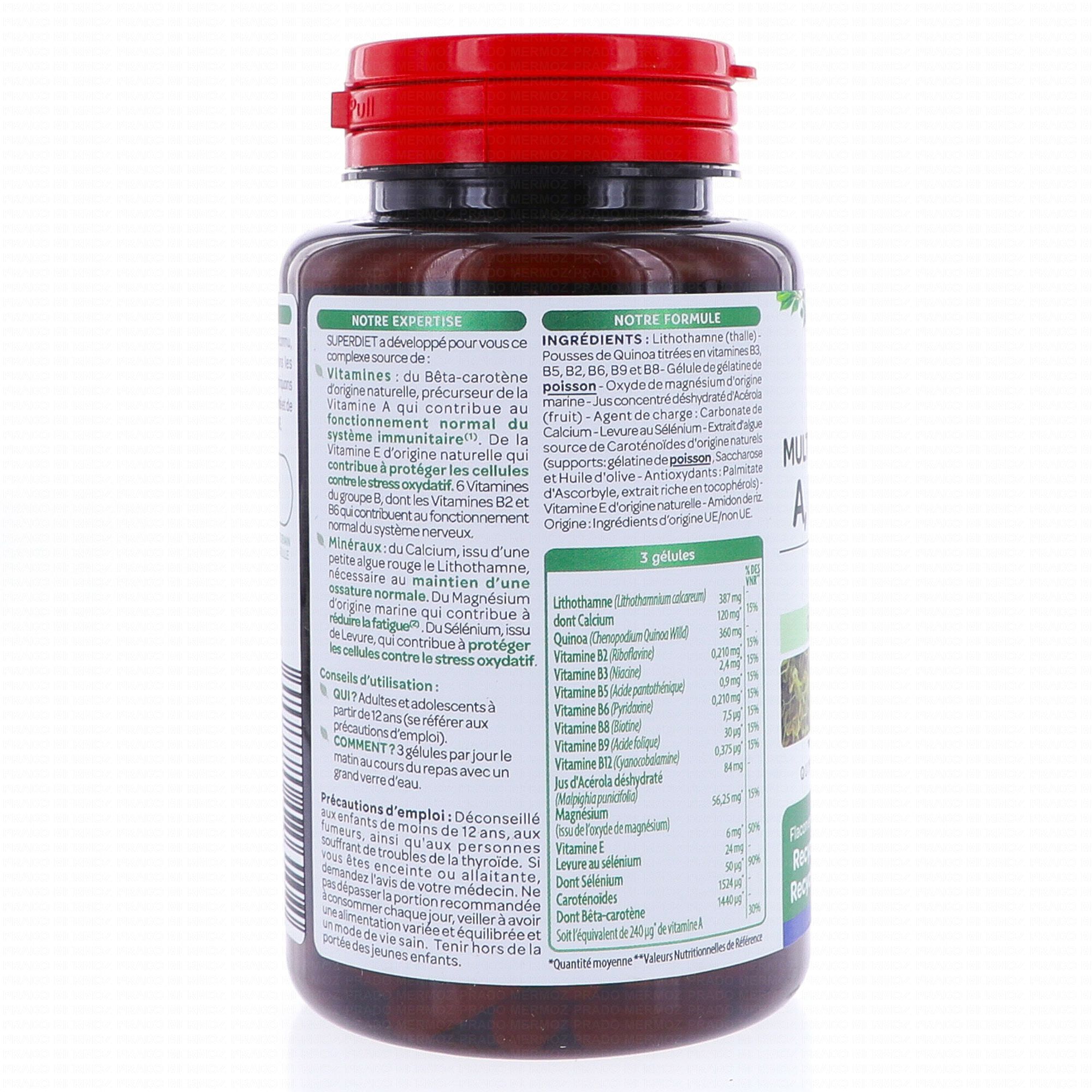 En stockSUPERDIET Multivitamines & Minéraux est un complément alimentaire aux multivitamines et minéraux d'origine végétale et marine. Il contient de la vitamine A, des vitamines du groupe B et de la vitamine E. Il contient également du calcium extrait du lithothamne, du magnésium et du sélénium.