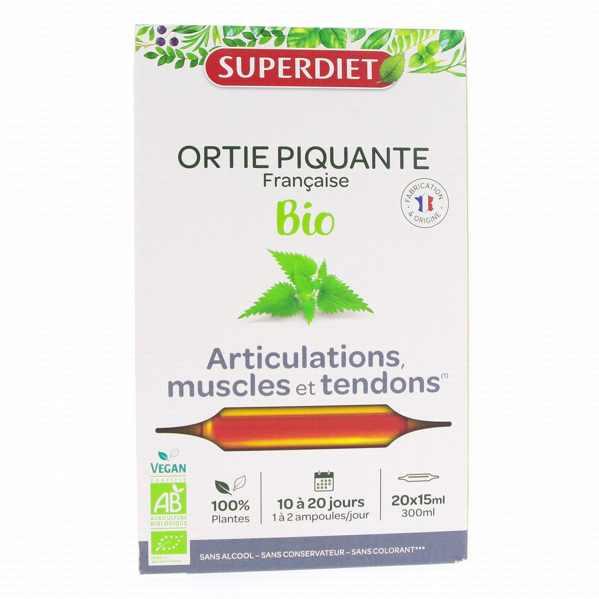 SUPERDIET Ortie Piquante bio articulations ampoules 15ml x 20 est un complément alimentaire qui participe à la bonne santé des muscles, des tendons et des articulations grâce à la présence d'Ortie.