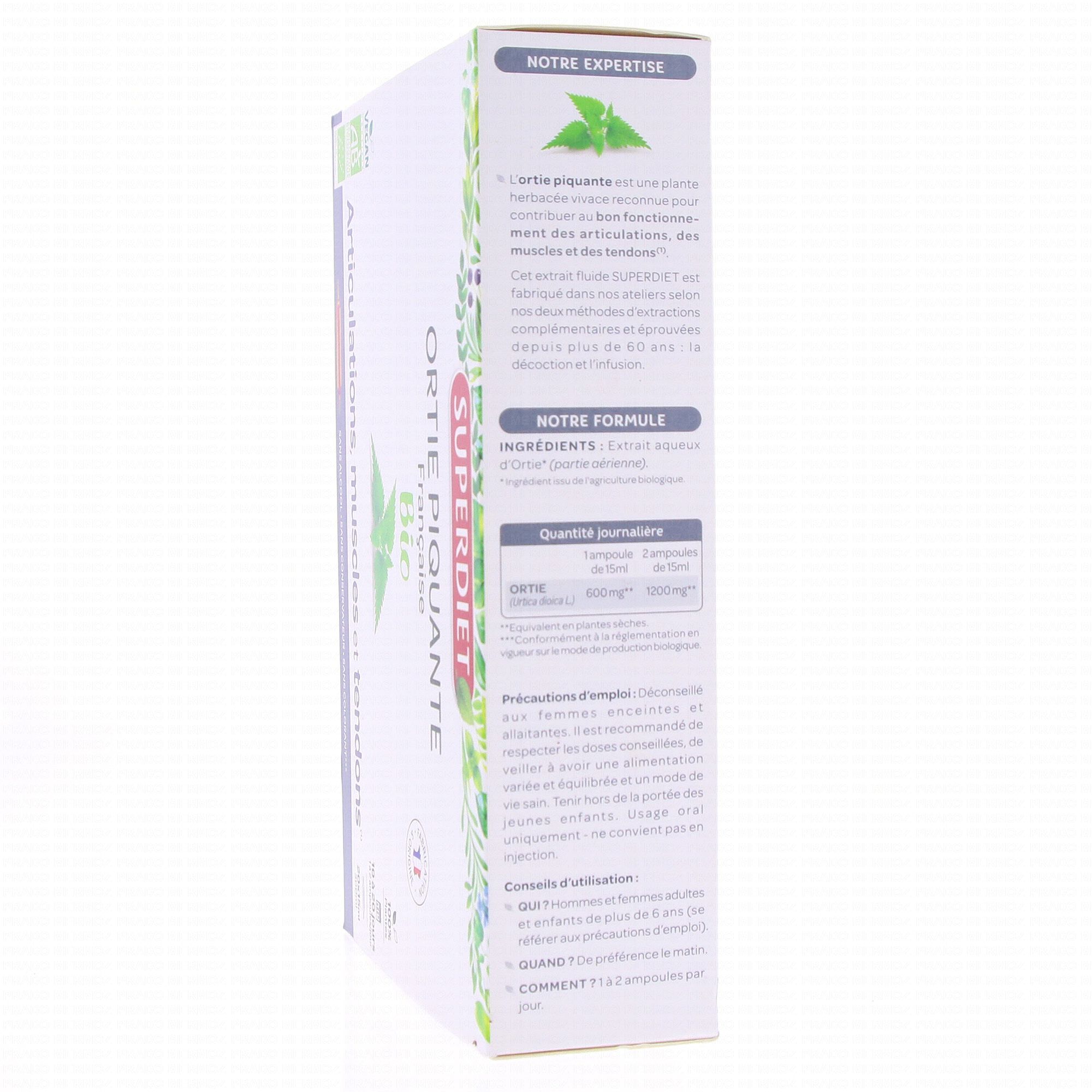 SUPERDIET Ortie Piquante bio articulations ampoules 15ml x 20 contient les éléments suivants :