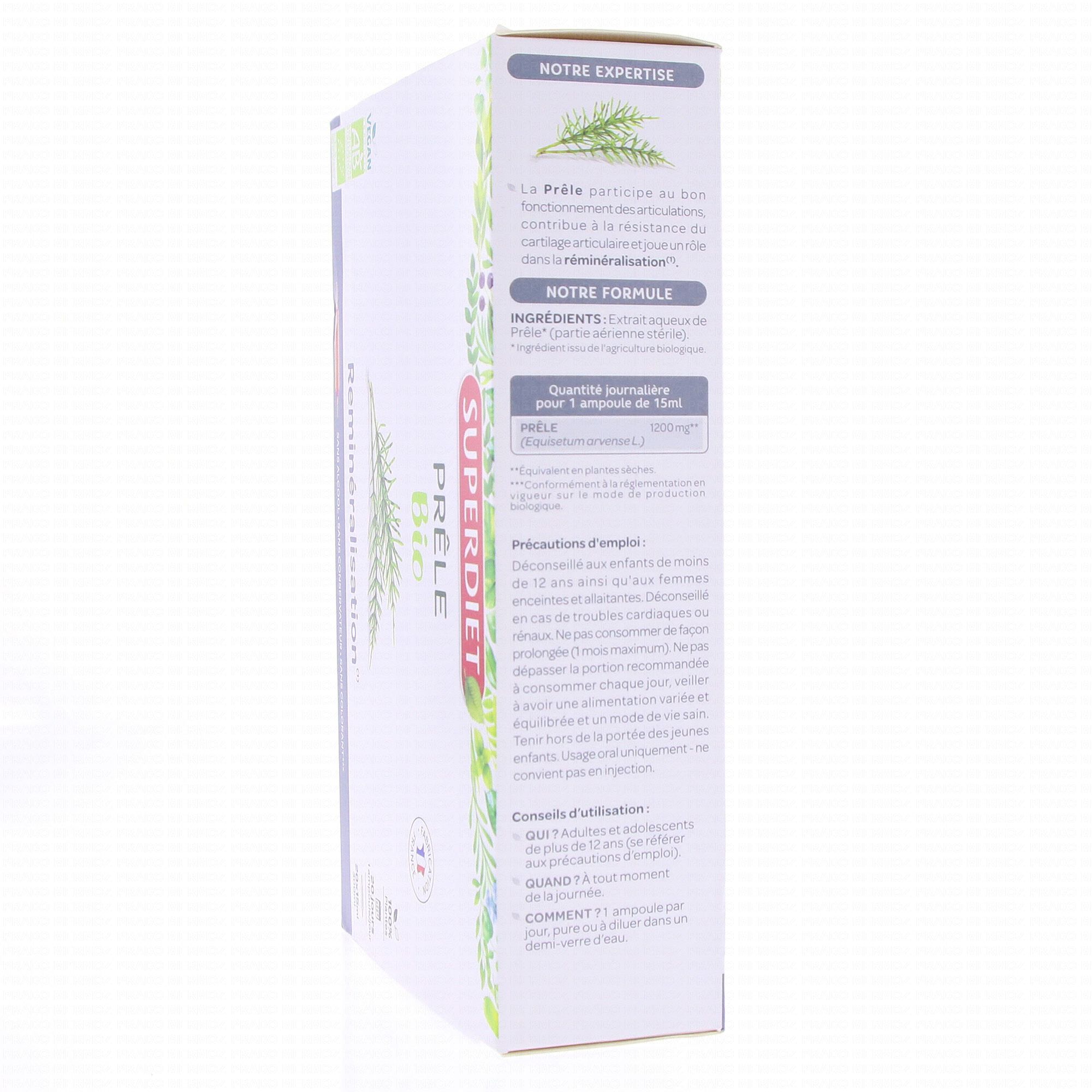 A base de prêle issue de l'agriculture biologique, le complément alimentaire Super diet Prêle Bio favorise la souplesse des articulations et améliore la reminéralisation. Agriculture biologique. Sans alcool, sans conservateur. Agriculture biologique. Conditionnement : ampoule autocassable de 15 ml sous étui carton. Traditionnellement utilisée pour faciliter les fonctions d'élimination de l'organisme. Reminéralisation en période de croissance, chute de cheveux, ongles cassants, consolidation de fracture.
