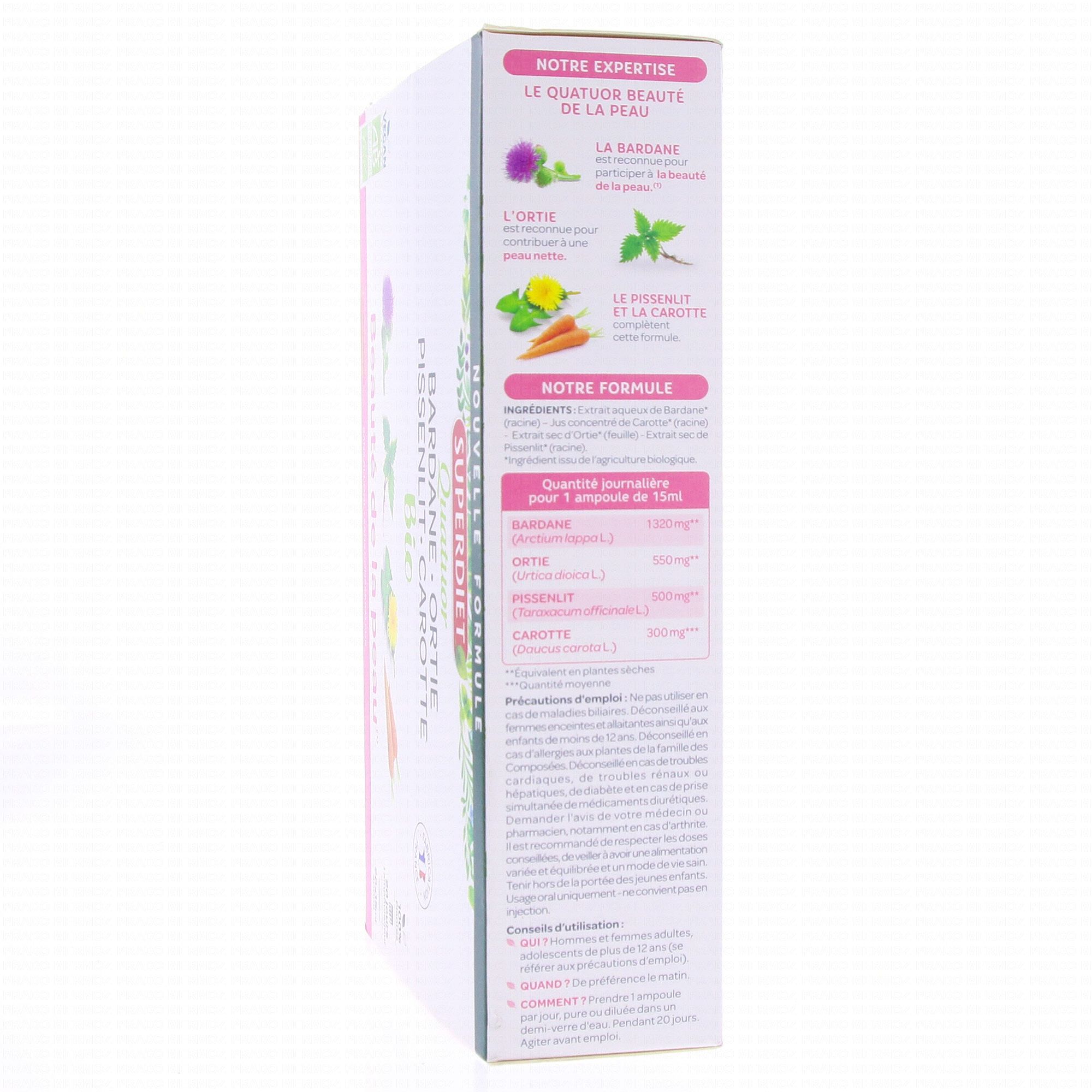 SUPER DIET Quatuor beauté de la peau bio 15ml x20 ampoules est un complément alimentaire qui contribue à la beauté de la peau grâce à la présence de Bardane et de Pensée sauvage. Le pissenlit participe aux fonctions d'élimination de l'organisme.
