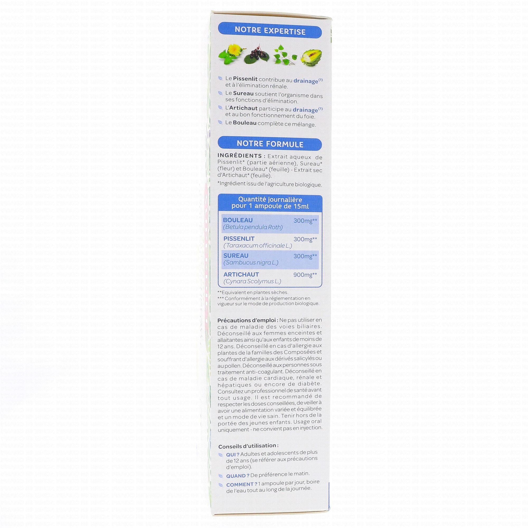 Composition : 15 ml (1 ampoule) Bouleau: 300 mg**; Pissenlit: 300 mg**; Sureau: 300 mg**; Artichaut: 900 mg**