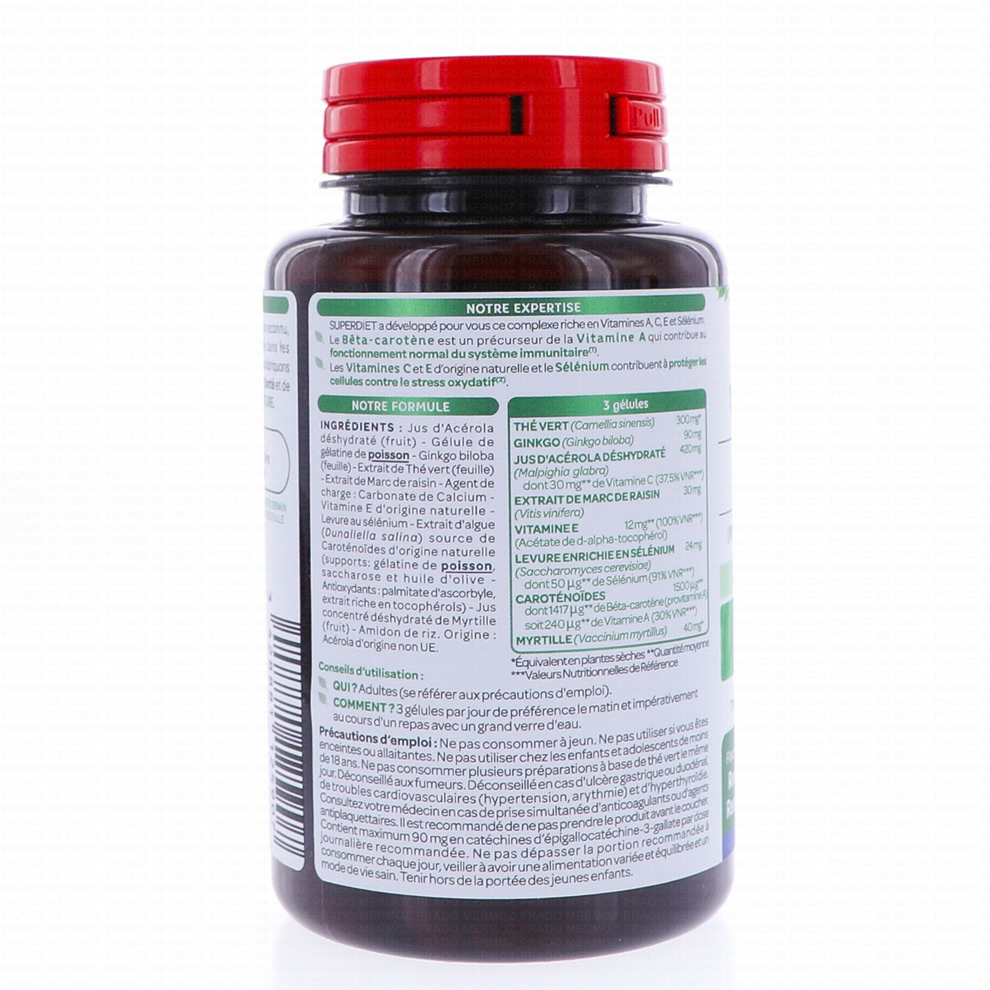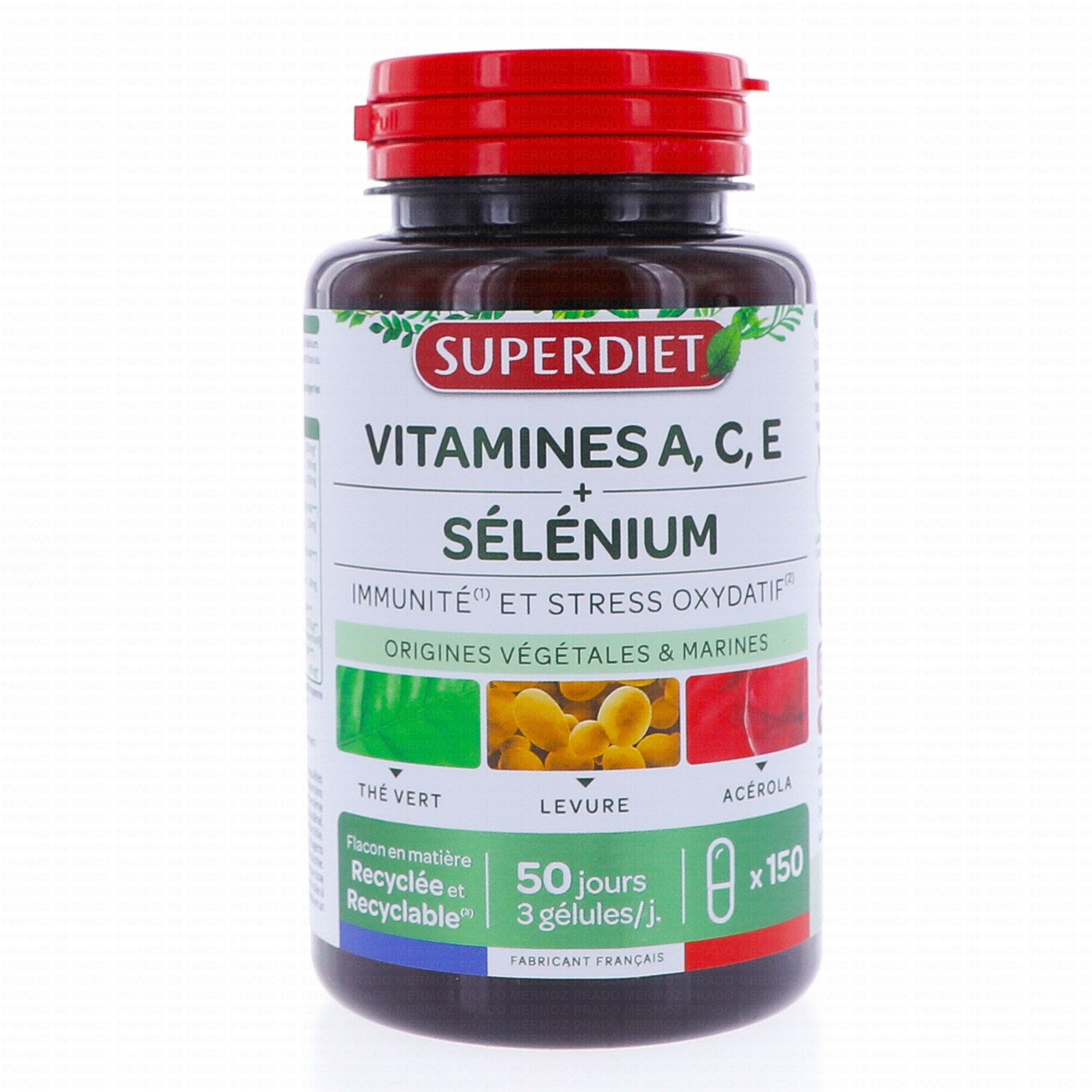 SUPERDIET Vitamines A, C, E Sélénium est un complément aux extraits végétaux riche en vitamines A, C et E. Il contient également du sélénium qui contribue au fonctionnement normal du système immunitaire.