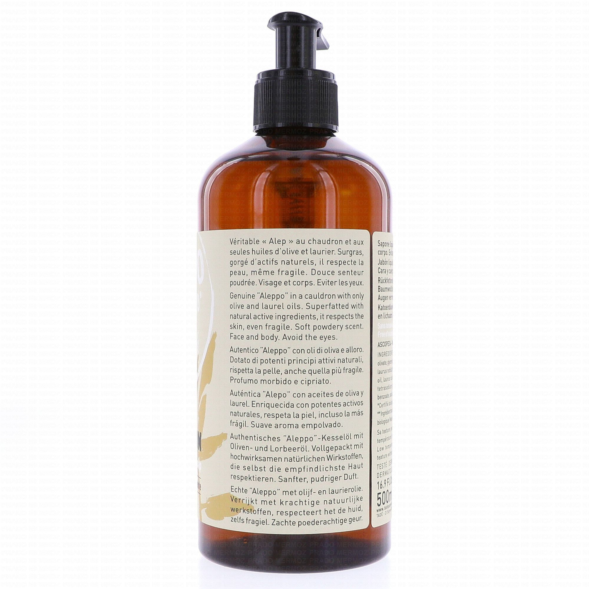 Le savon liquide d'alep nettoie et parfume la peau délicatement grâce à sa fabrication artisanale fidèle au procédé aleppin, de qualité cosmétique supérieure. Ultra doux, à base d'huile d'olive saponifiée par la potasse à l'ancienne au chaudron, en discontinu il hydrate les peaux sèches de toute la famille et y laisse un doux parfum de fleur de coton.