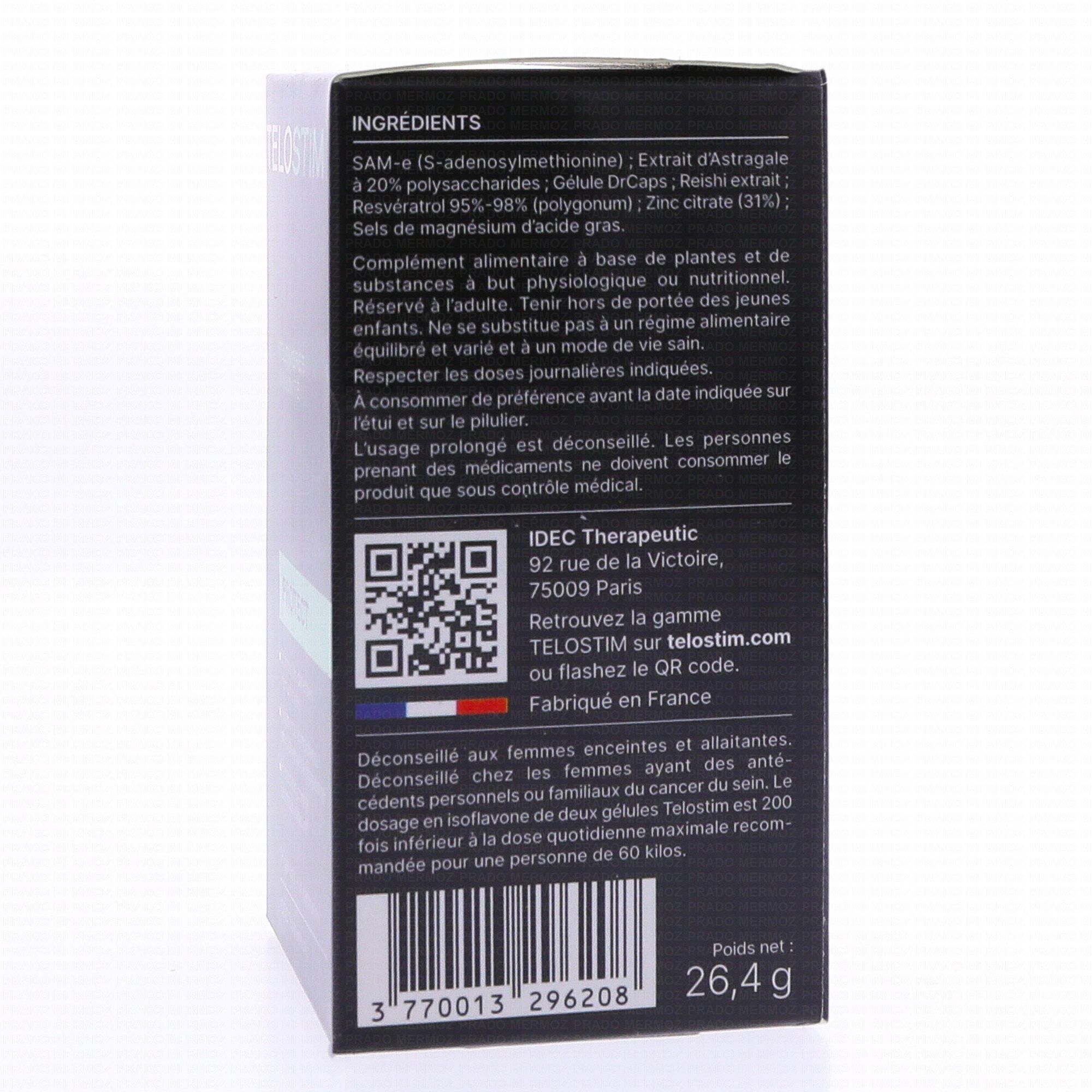 TELOSTIM Protect Télomères Immunité 56 gélules est un complément alimentaire qui contribue à maintenir un système immunitaire sain grâce à la présence d'Astragale et de Zinc.