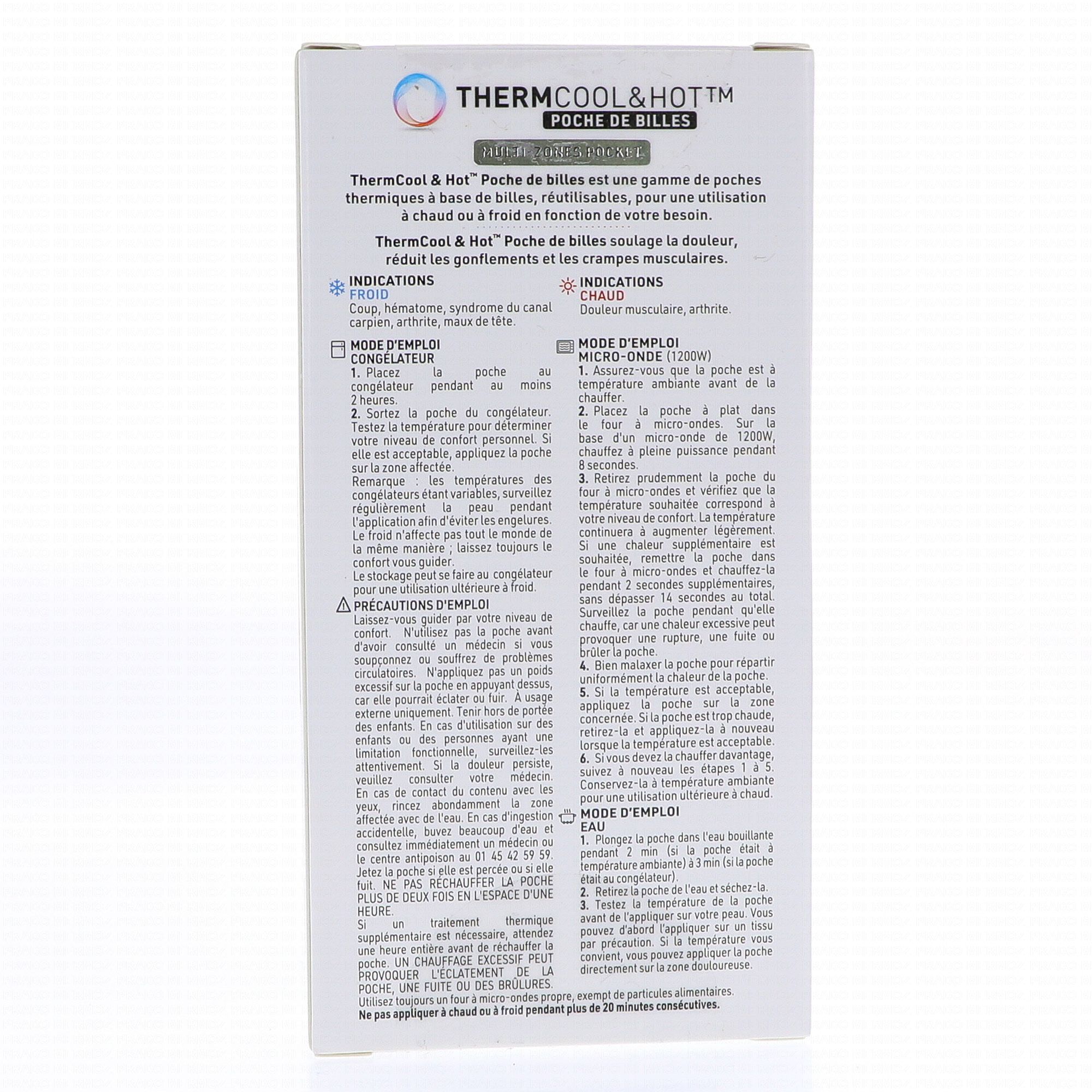Pour utiliser la ThermCool&Hot Poche de Billes Multizones Pocket, vous pouvez la chauffer au micro-ondes 8 secondes (1200W), malaxer pour répartir la chaleur et l'appliquer sur la zone douloureuse, en ajoutant 2 secondes si nécessaire sans dépasser 14 secondes. Pour l'utiliser froide, placez-la au congélateur au moins 2 heures, testez la température et appliquez-la en surveillant le confort. Vous pouvez aussi la chauffer au bain-marie 2 à 3 minutes selon sa température initiale, sécher, tester la chaleur et appliquer sur la zone concernée, en commençant par un tissu si besoin.