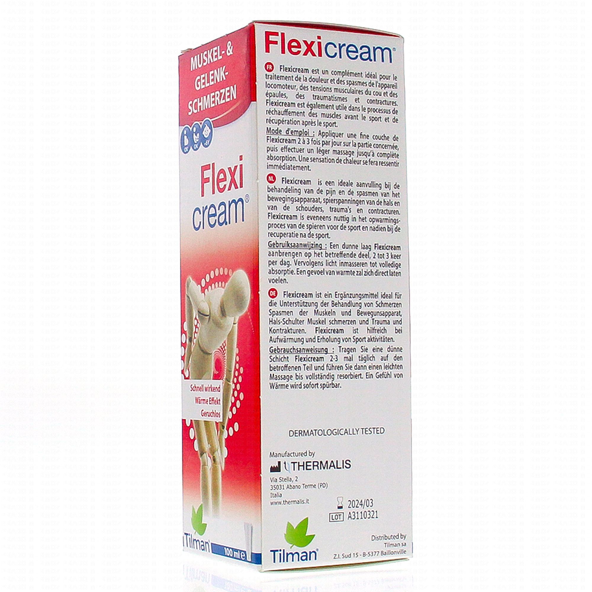 Appliquer une fine couche de Flexicream 2 à 3 fois par jour sur la partie concernée. Masser jusqu'à complète absorption. Selon la zone, une sensation de chaleur se fera ressentir immédiatement.