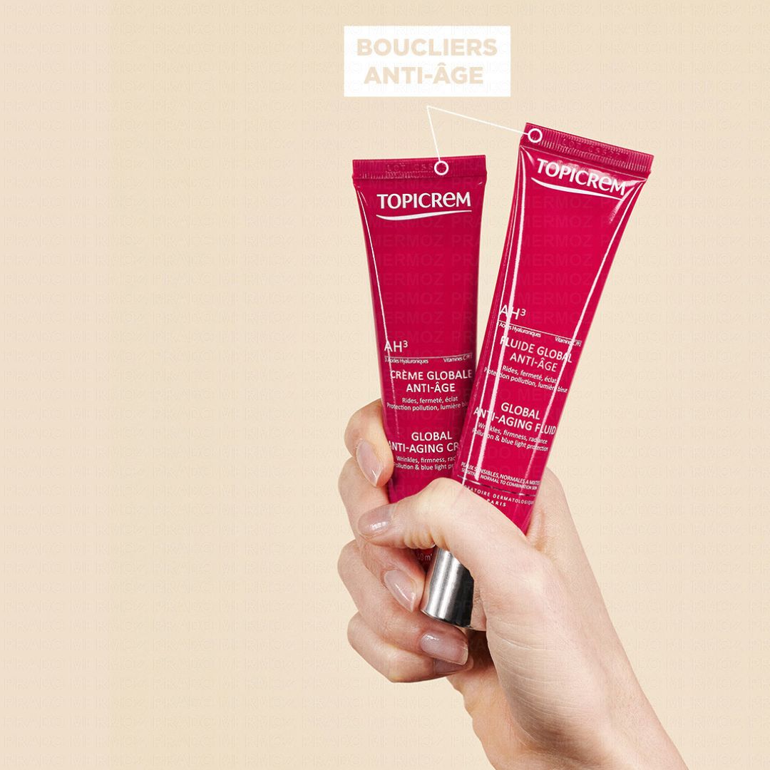 AH3 Fluide Global Anti-Âge est une alliance parfaite d'actifs dermatologiques de référence pour l'anti-âge : 3 acides hyaluroniques de haute pureté et de tailles différentes pour agir à tous les niveaux de la peau, 1 Dipeptide pour lutter contre le stress oxydatif, 3 vitamines pour réveiller l'éclat du teint et l'uniformiser ainsi qu'une protection contre la pollution et la lumière bleue !