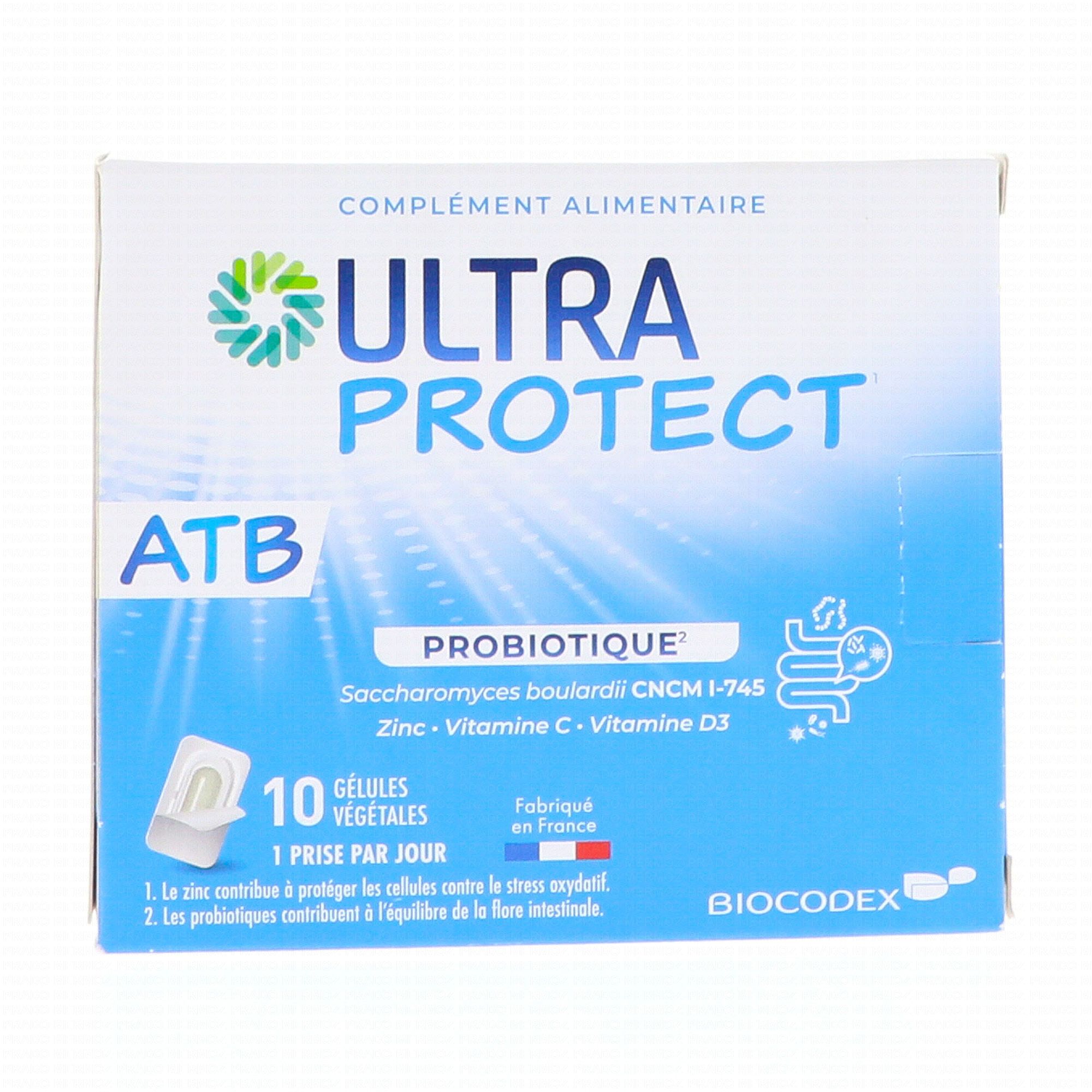 BIOCODEX Ultra Protect - ATB Probiotique x10 Gélules est un complément alimentaire qui contribue à l'équilibre de la flore intestinale grâce à la présence de Saccharomyces boulardii. La vitamine C, le Zinc et la vitamine D aident à renforcer le système immunitaire.
