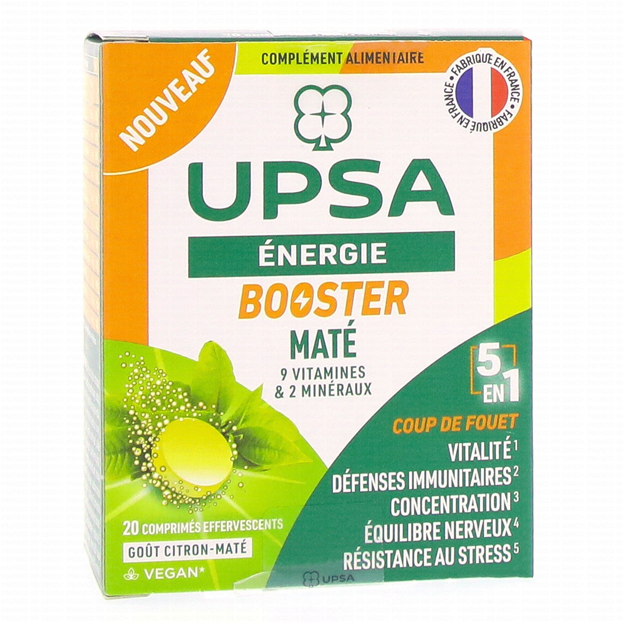 UPSA Energie Booster 5 en 1 x20 comprimés effervescents est un complément alimentaire qui contribue à une activité optimale des fonctions physiques et mentales grâce à la présence de Maté. Le Magnésium aide à réduire la fatigue et favorise le fonctionnement normal du système nerveux. L'ensemble des vitamines du groupe B contribuent au fonctionnement énergétique normal.