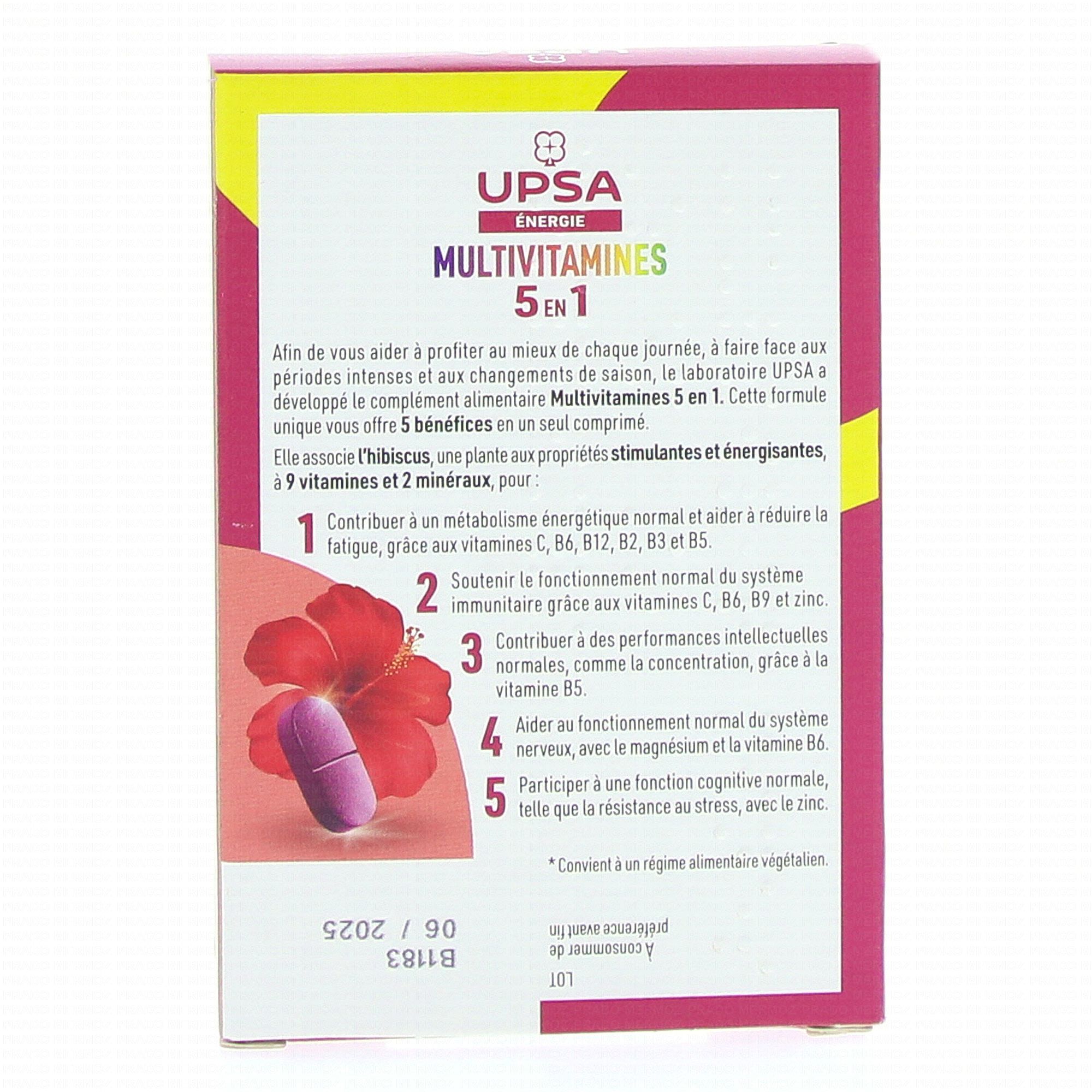 UPSA Energie Multivitamines Hibiscus x30 comprimés est un complément alimentaire qui contribue à réduire la fatigue grâce à la présence d'Hibiscus et de vitamine C. L'ensemble des vitamines du groupe B contribuent au fonctionnement énergétique normal. Le Zinc et la vitamine C aident à renforcer le système immunitaire.
