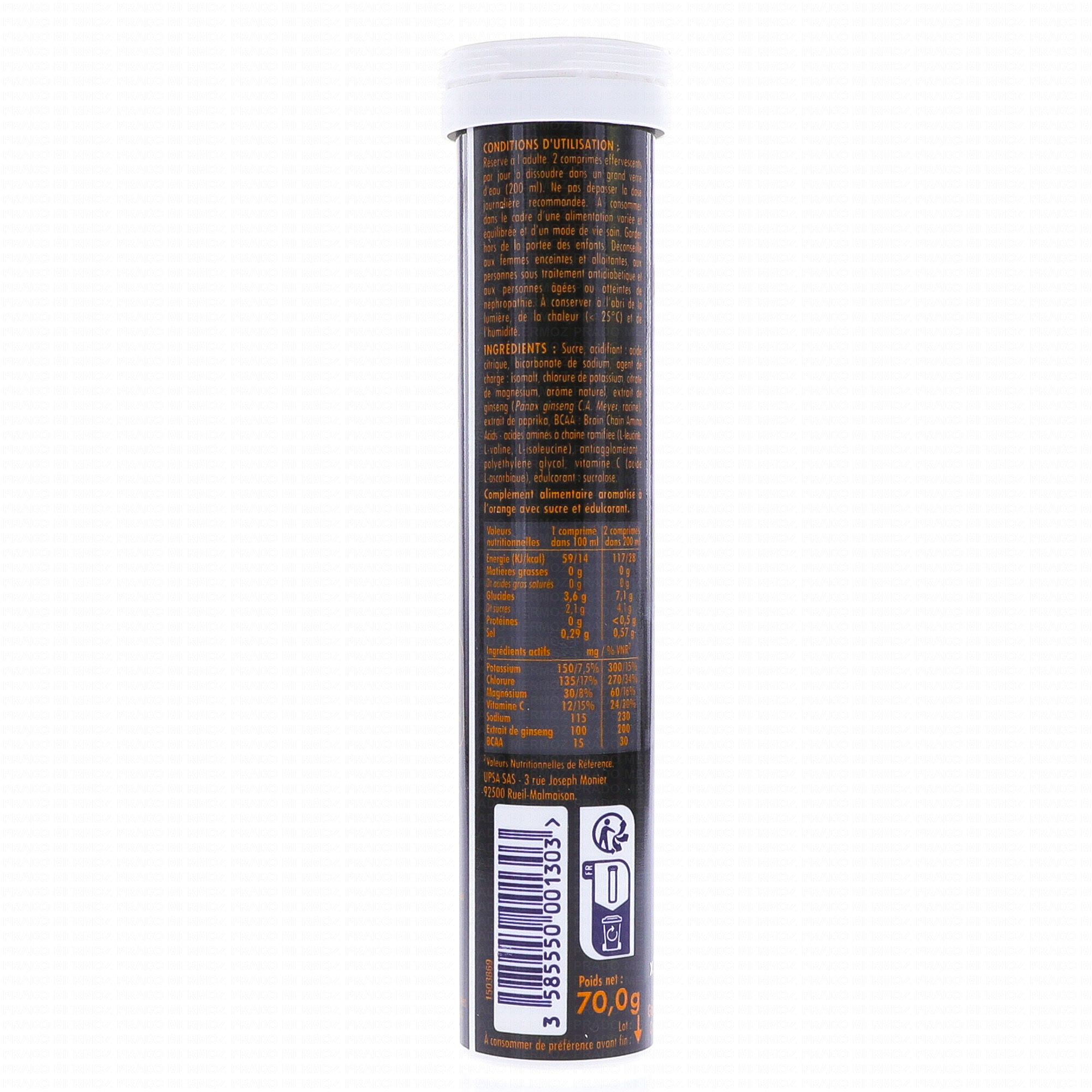 Ingrédients pour 2 comprimés : Sucre (4 g), Acidifiant : Acide Citrique, Bicarbonate De Sodium (Sodium 230 mg), Agent De Charge : Isomalt, Chlorure De Potassium (Potassium 300 mg - 15% VNR*, Chlorure 270 mg - 34% VNR*), Citrate De Magnésium (Magnésium 60 mg - 16% VNR*), Arôme Naturel, Extrait De Ginseng 200 mg (Panax Ginseng C.A. Meyer, Racine), Extrait D'Huile De Paprika, BCAA - Acides Aminés À Chaîne Ramifiée 15 mg (L-Leucine, L-Valine, L-Isoleucine), Antiagglomérant : Polyéthylène Glycol, Vitamine C 24 mg - 30% VNR* (Acide L-Ascorbique), Édulcorant : Sucralose.