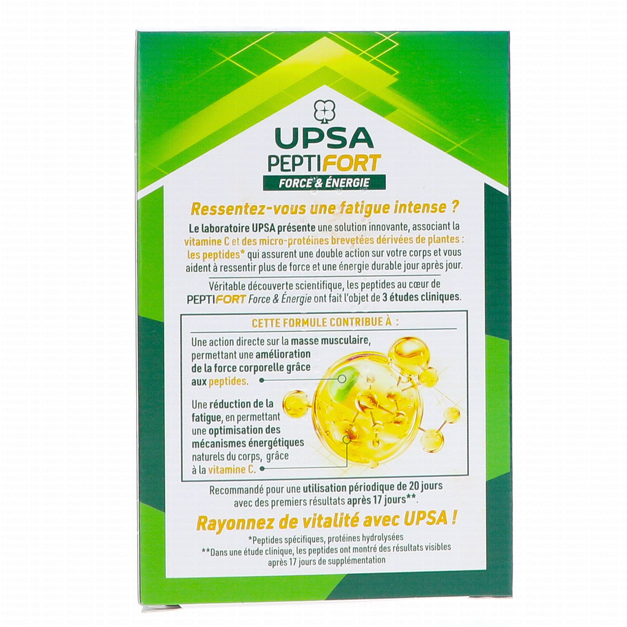UPSA Peptifort est un complément alimentaire à base de peptides issus de protéines hydrolysées de fèves et de vitamine C qui contribue à réduire la fatigue.