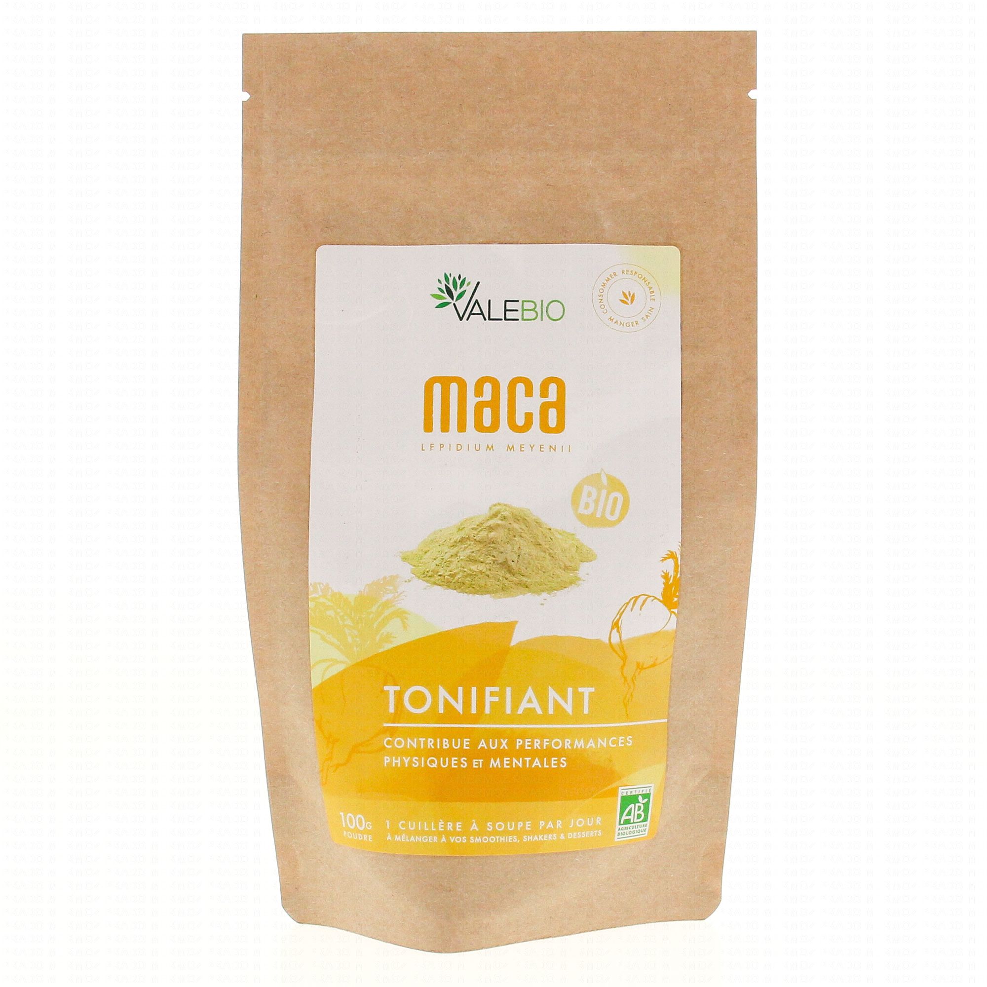 VALEBIO SuperFood Maca BIO sachet 100g est un complément alimentaire qui contribue au soutien des performances physiques et mentales grâce à la présence de Maca.