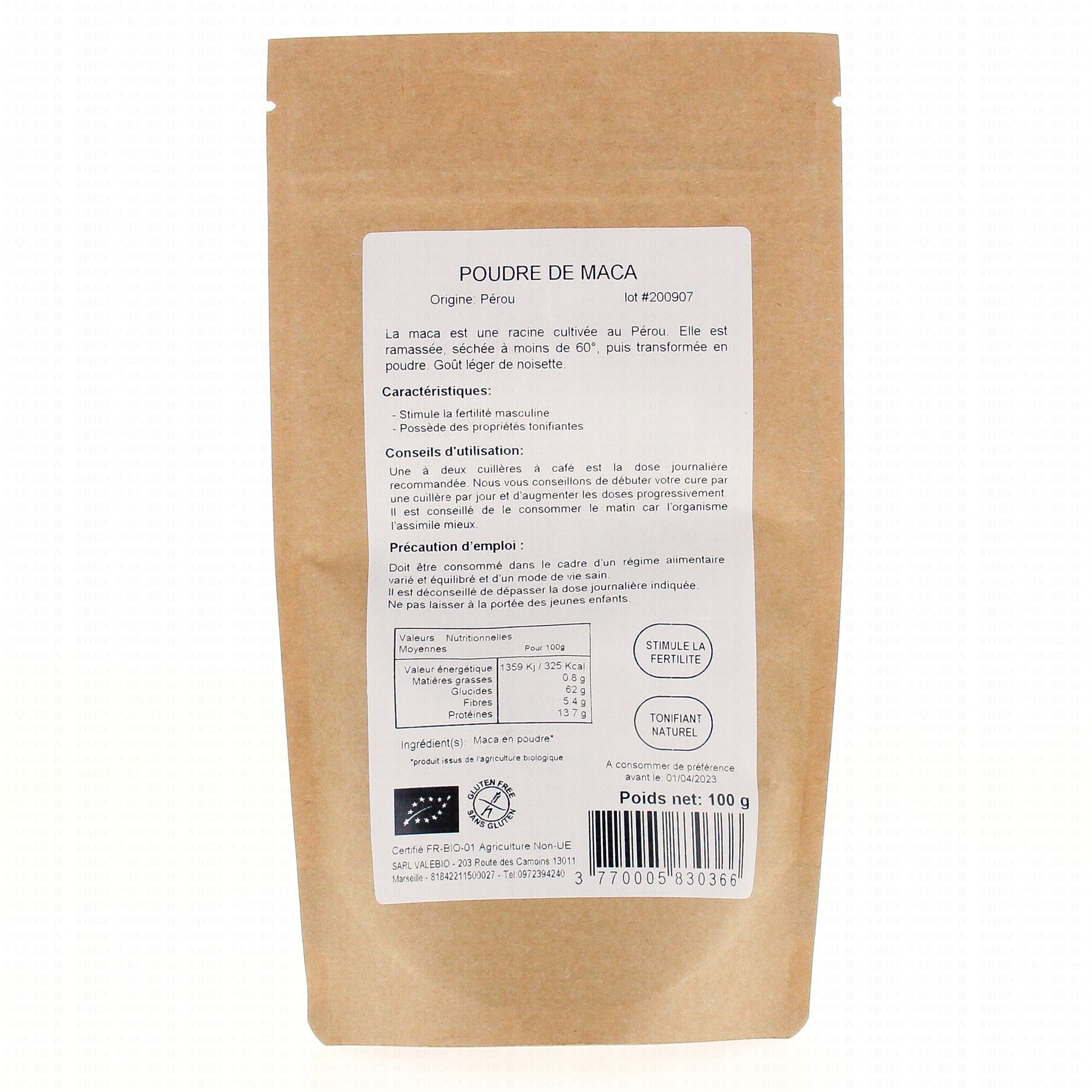 VALEBIO SuperFood Maca BIO sachet 100g contient les éléments suivants :