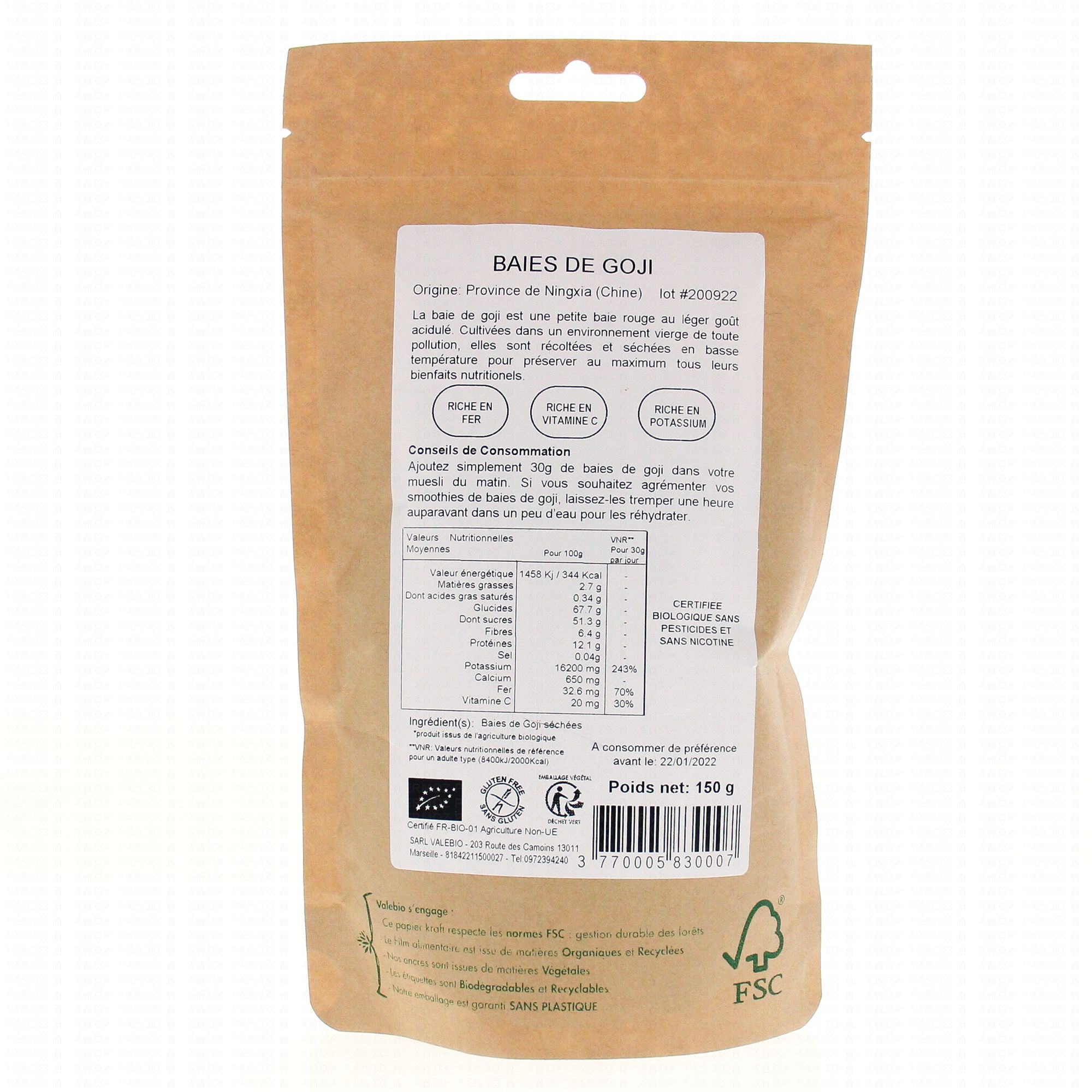 VALEBIO Super fruits baie de goji sachet contient les éléments suivants :