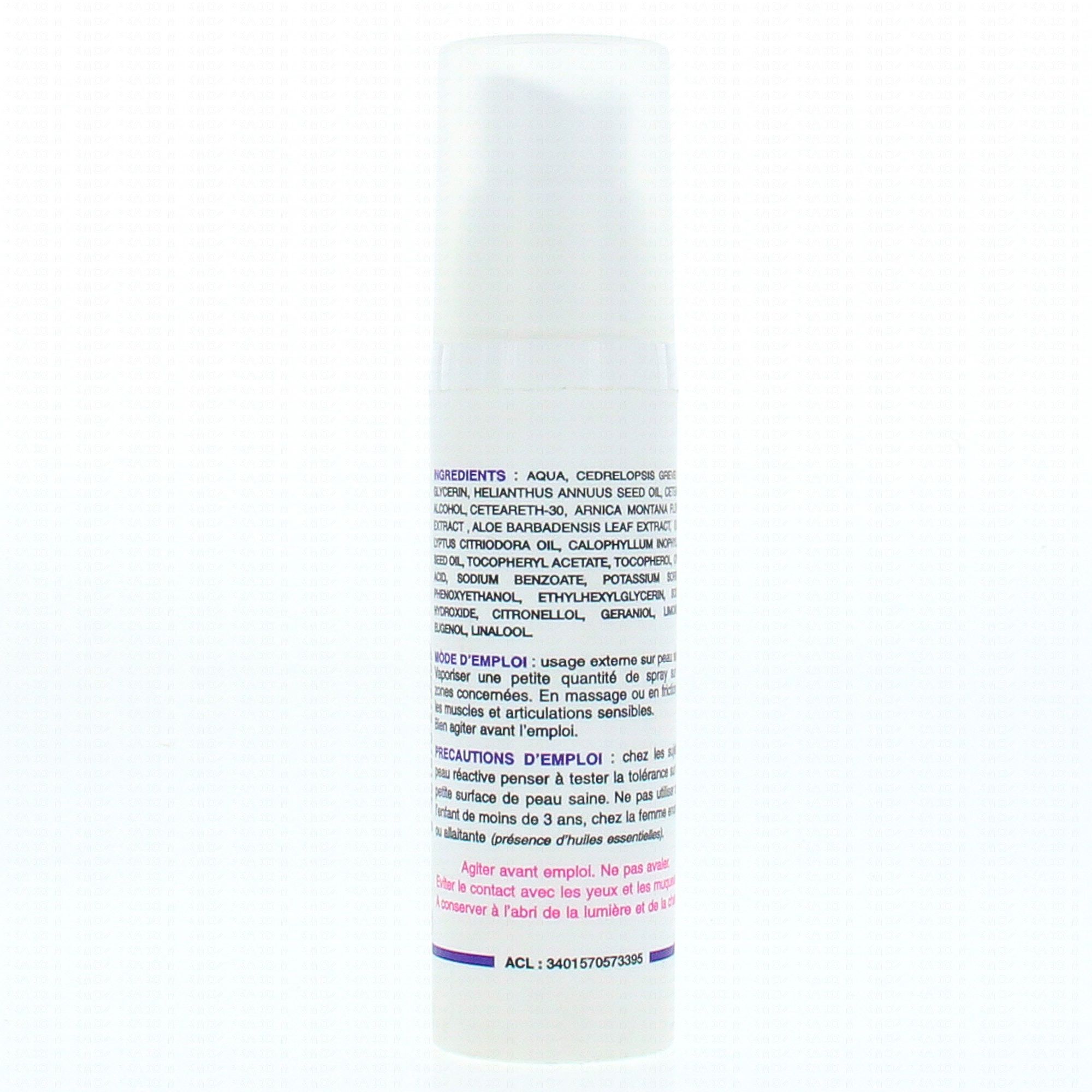 Usage externe sur peau saine. Vaporiser une petite quantité de spray sur les zones concernées. En massage ou en friction sur les muscles et les articulations sensibles. Bien agiter avant emploi. Chez les sujets à peau réactive, penser à tester la tolérance du produit en utilisant une petite quantité de produit sur une petite surface de peau saine. Ne pas utiliser chez l'enfant de moins de 3 ans, chez la femme enceinte ou allaitante ( présence d'huiles essentielles).