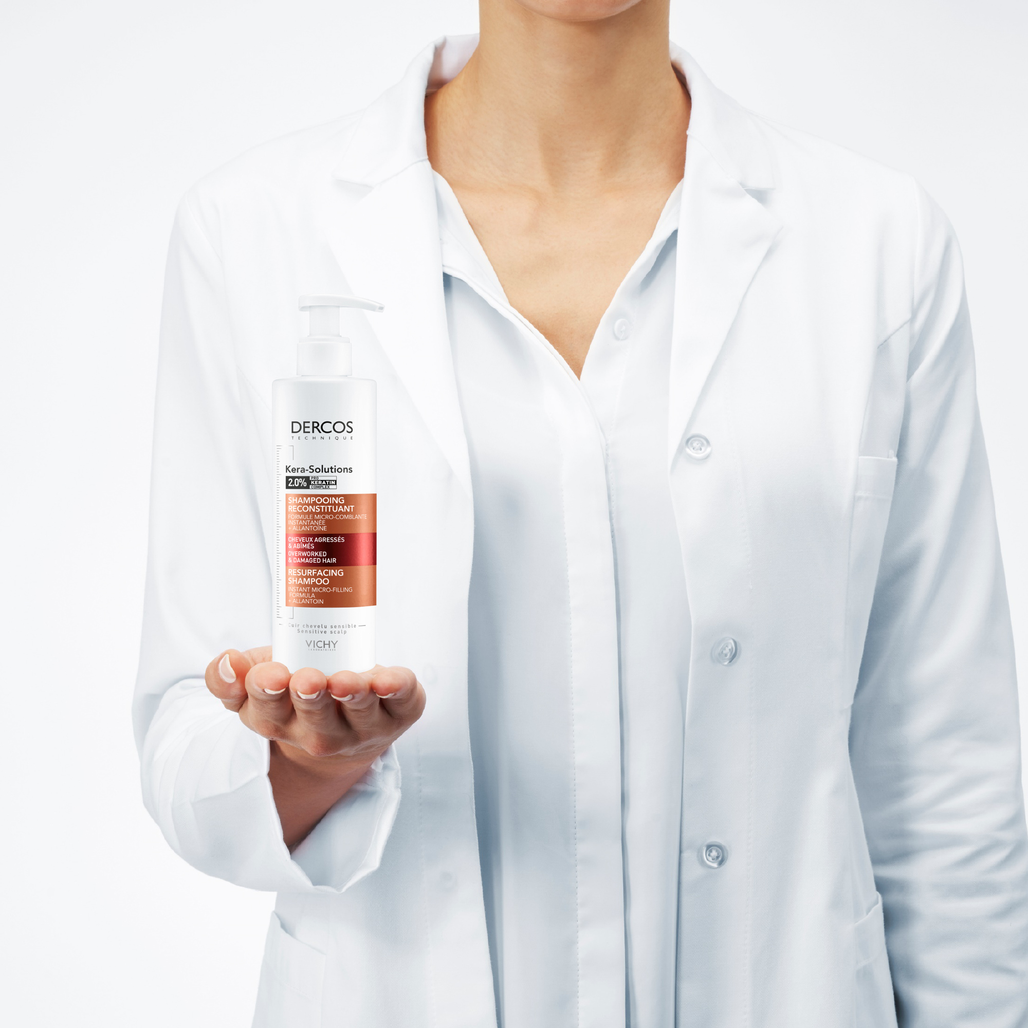 Appliquer le shampooing Vichy Dercos Kerasolution sur les cheveux mouillés, masser délicatement puis rincer à l'eau claire. Faire suivre par l'application du Masque Dercos Kera-Solutions.