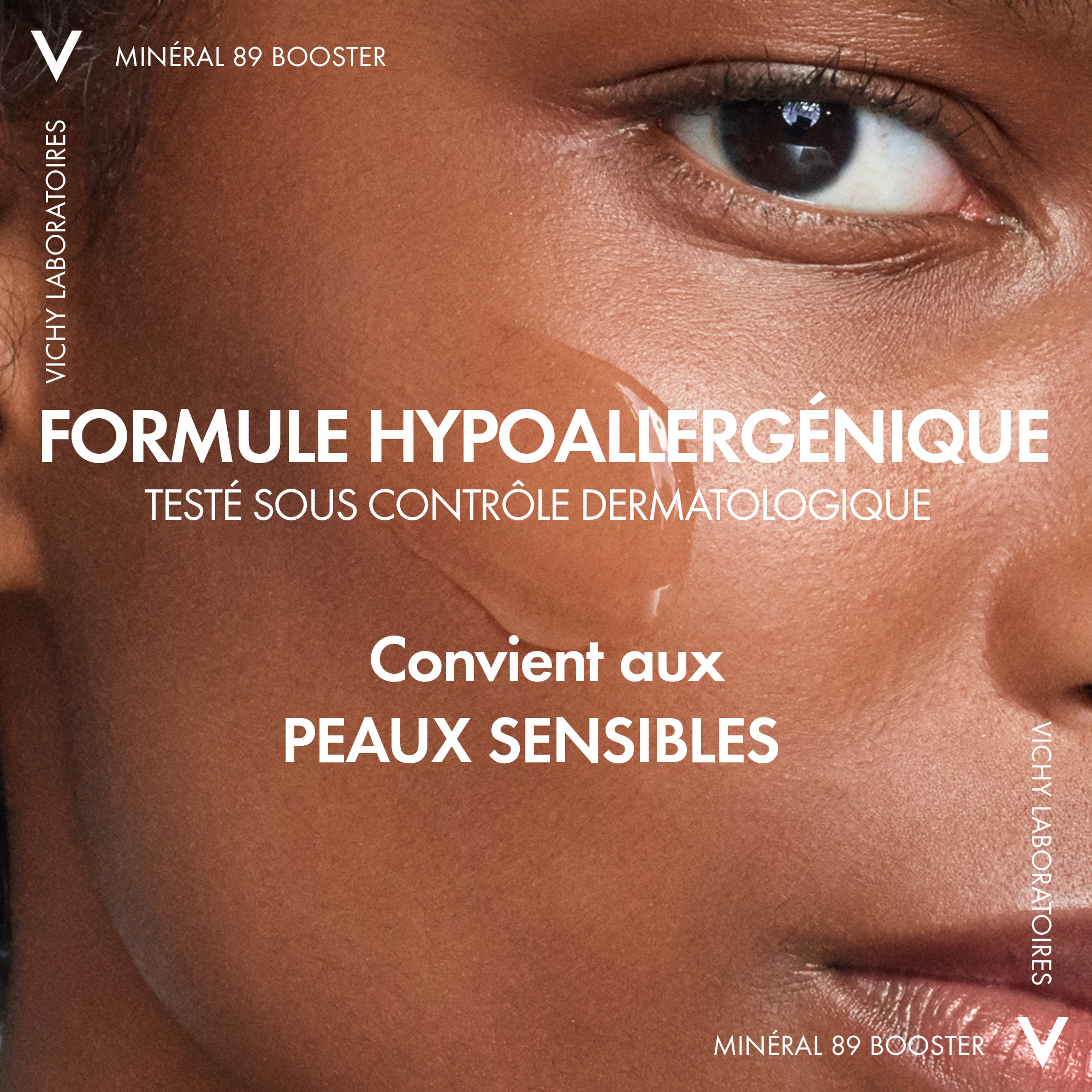 Le soin VICHY Mineral 89 associe l'Eau Thermale Minéralisante de Vichy dosée à 89% à l'acide hyaluronique, hautement concentré. Sa formule hypoallergénique, sans silicone, sans paraben, sans parfum, et sans colorant est parfaitement adaptée aux peaux sensibles.