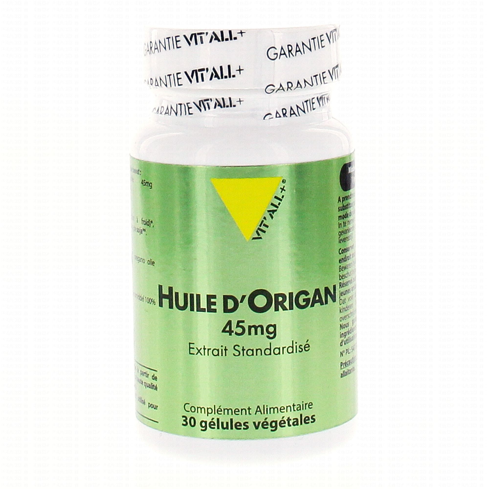 VIT'ALL+ Huile d'Origan 45 mg 30 gélules L'Origan (Origanum compactum) contribue à la résistance de l'organisme grâce à ses propriétés anti-infectieuses. Il est également traditionnellement utilisé pour contribuer au confort digestif par ses propriétés anti-spasmodiques.