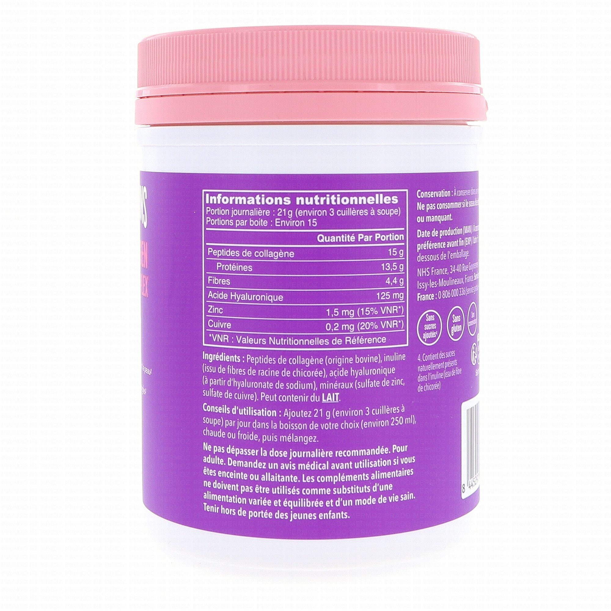 Peptides de collagène (origine bovine), inuline (issu de fibres de racine de chicorée), acide hyaluronique, minéraux (sulfate de zinc, sulfate de cuivre).
