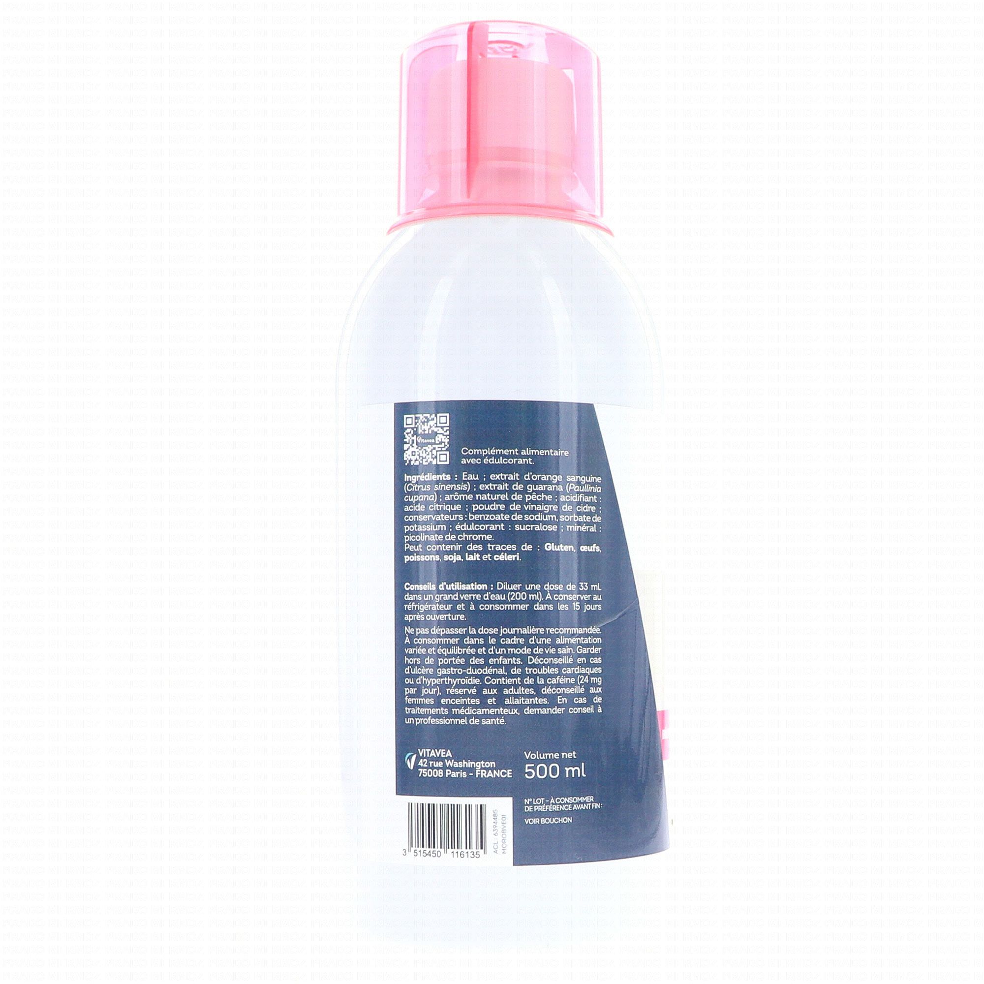 Extrait d'orange sanguine (Citrus sinensis) ; extrait de guarana (Paullinia cupana) ; arôme naturel de pêche ; acidifiant : acide citrique ; poudre de vinaigre de cidre ; conservateurs : benzoate de sodium, sorbate de potassium ; édulcorant : sucralose ; minéral : picolinate de chrome.