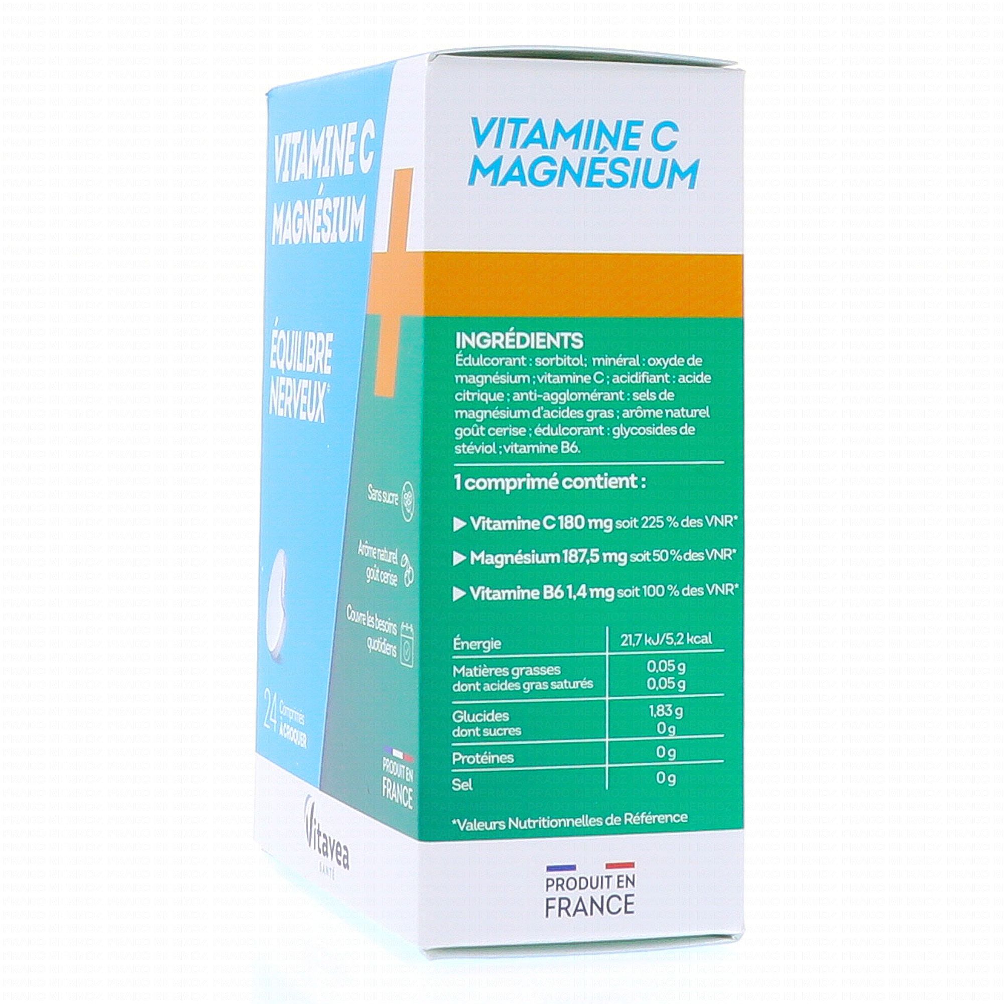 VITAVEA Comprimés à croquer vitamine C + magnesium 24 comprimés contient les éléments suivants :