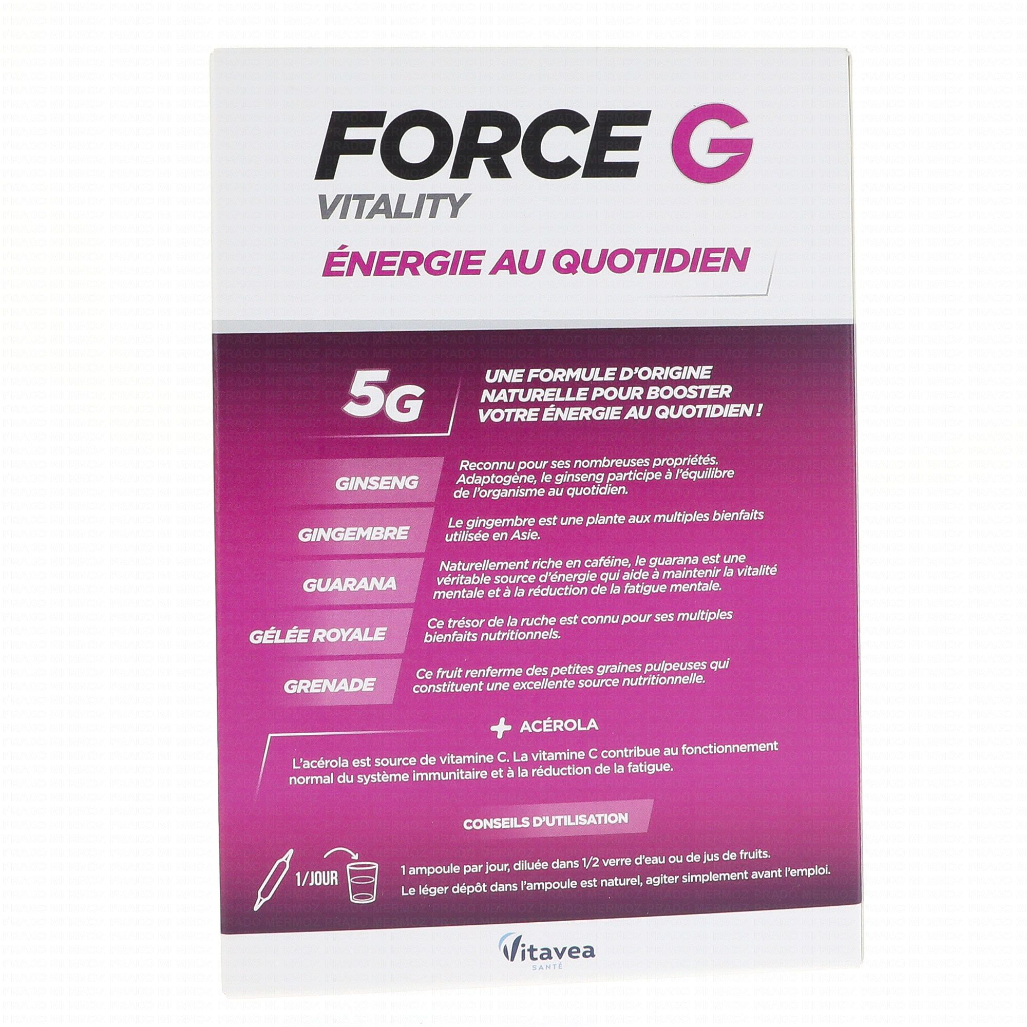 VITAVEA Force G Vitality énergie au quotidien x15 Ampoules + 5 Offertes est un complément alimentaire qui contribue à réduire la fatigue grâce à la présence de Gingembre. Le Ginseng favorise le maintien de bonnes capacités physiques et mentales. La Gelée Royale et l'Acérola aident à renforcer le système immunitaire.