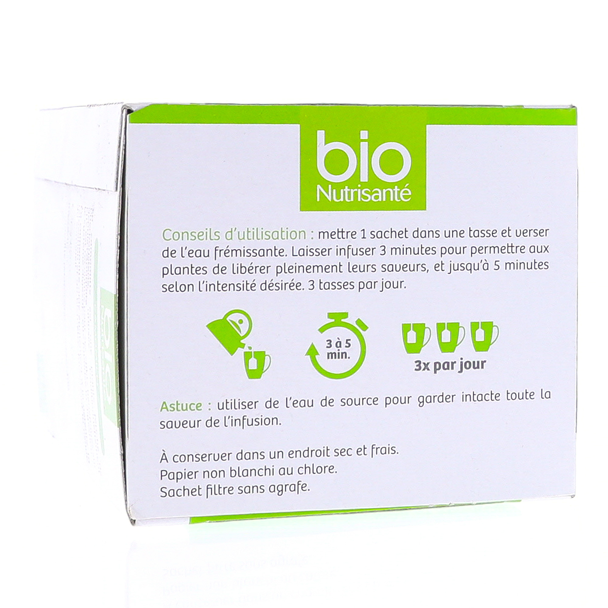 Les infusions Bio Nutrisante sont à 100% à base naturelle. Naturellement aromatisée à la camomille, aux vertus relaxantes, reposantes et digestives, l'infusion Nutrisanté favorise le confort digestif et contribue à réduire les tensions pour favoriser le sommeil profond. Irritabilité, stress, sommeil troublé, indigestion.