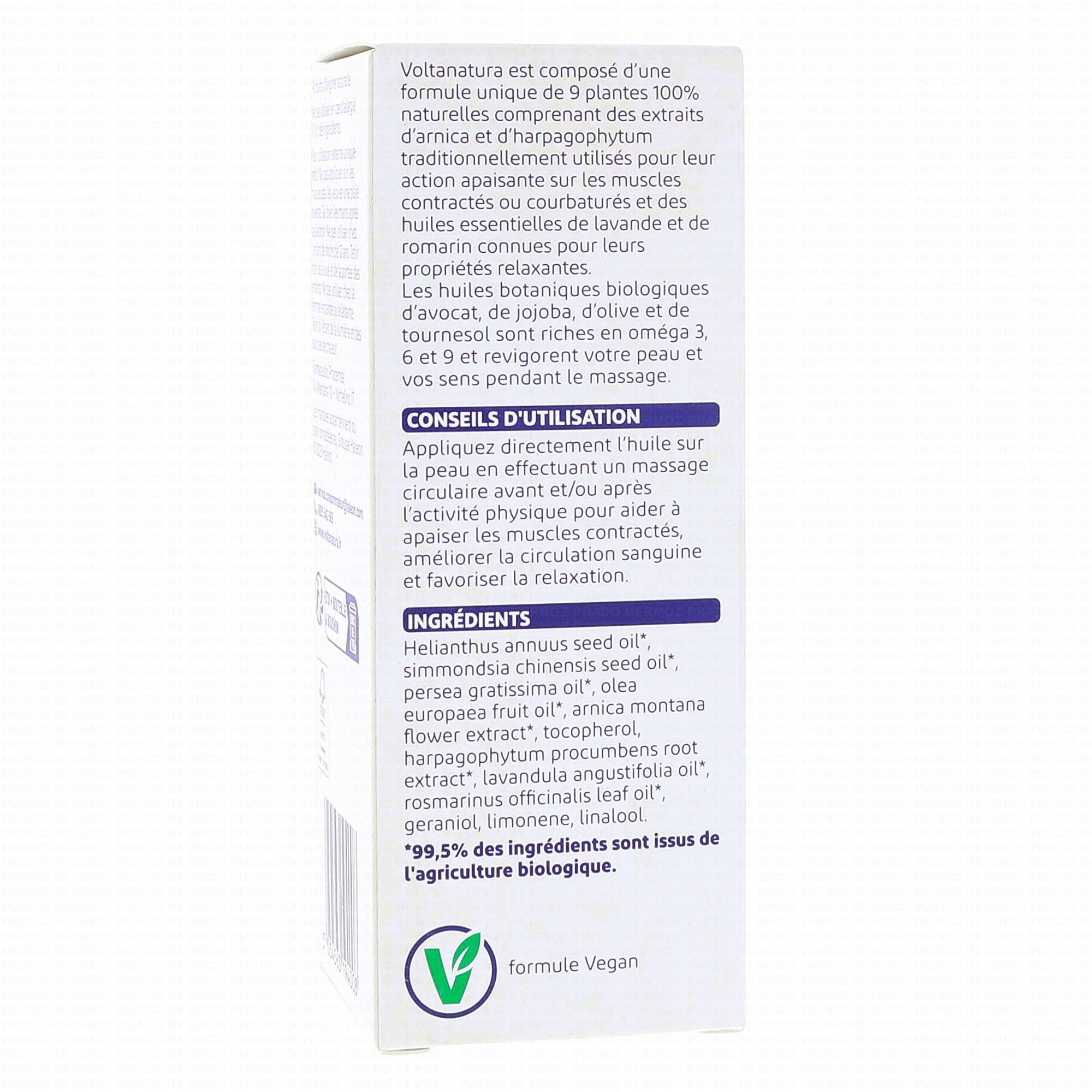L'huile de massage Bio Voltanatura renferme une formule unique associant 9 plantes 100% naturelles : de l'harpagophytum, de la lavande, du romarin, de l'avocat, de l'olive, du tournesol et de l'arnica. Elle contient ainsi 2 extraits de plantes, 2 huiles essentielles, 4 huiles végétales, ainsi que de la vitamine E, pour un total de 99,5% d'ingrédients d'origine biologique.