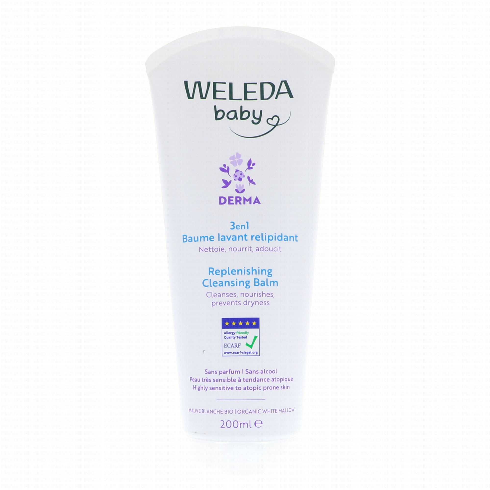 Le Baume lavant relipidant 3en1 Weleda Baby DERMA nettoie en douceur, nourrit et adoucit le visage, le corps et les cheveux des tout-petits. Pour les peaux très sensibles à tendance atopique, dès la naissance. Convient aussi aux adultes. Une formule sans savon enrichie avec 30% d'ingrédients hydratants et nourrissants pour nettoyer en douceur la peau sèche, sans la dessécher. Ne pique pas les yeux. Appliquer sur la peau et les cheveux mouillés. Faire mousser, rincer et sécher la peau en douceur.