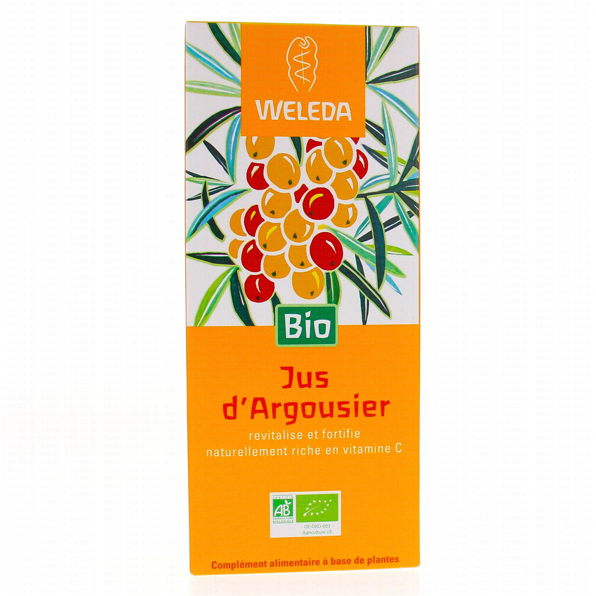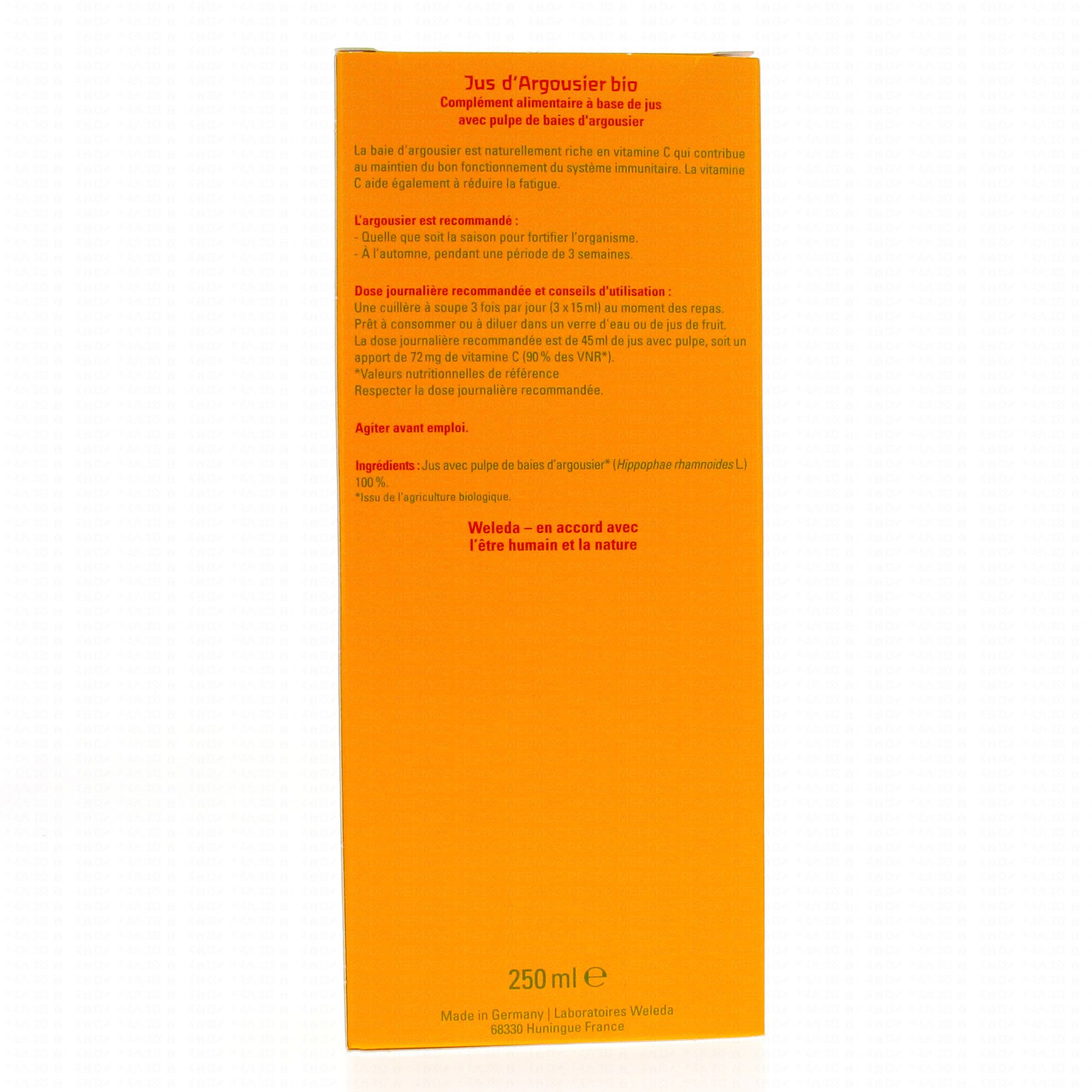100 % pur jus de baies d'argousier biologique riche en vitamine C, en provitamine A (bétacarotène), en vitamine E et en sels minéraux.