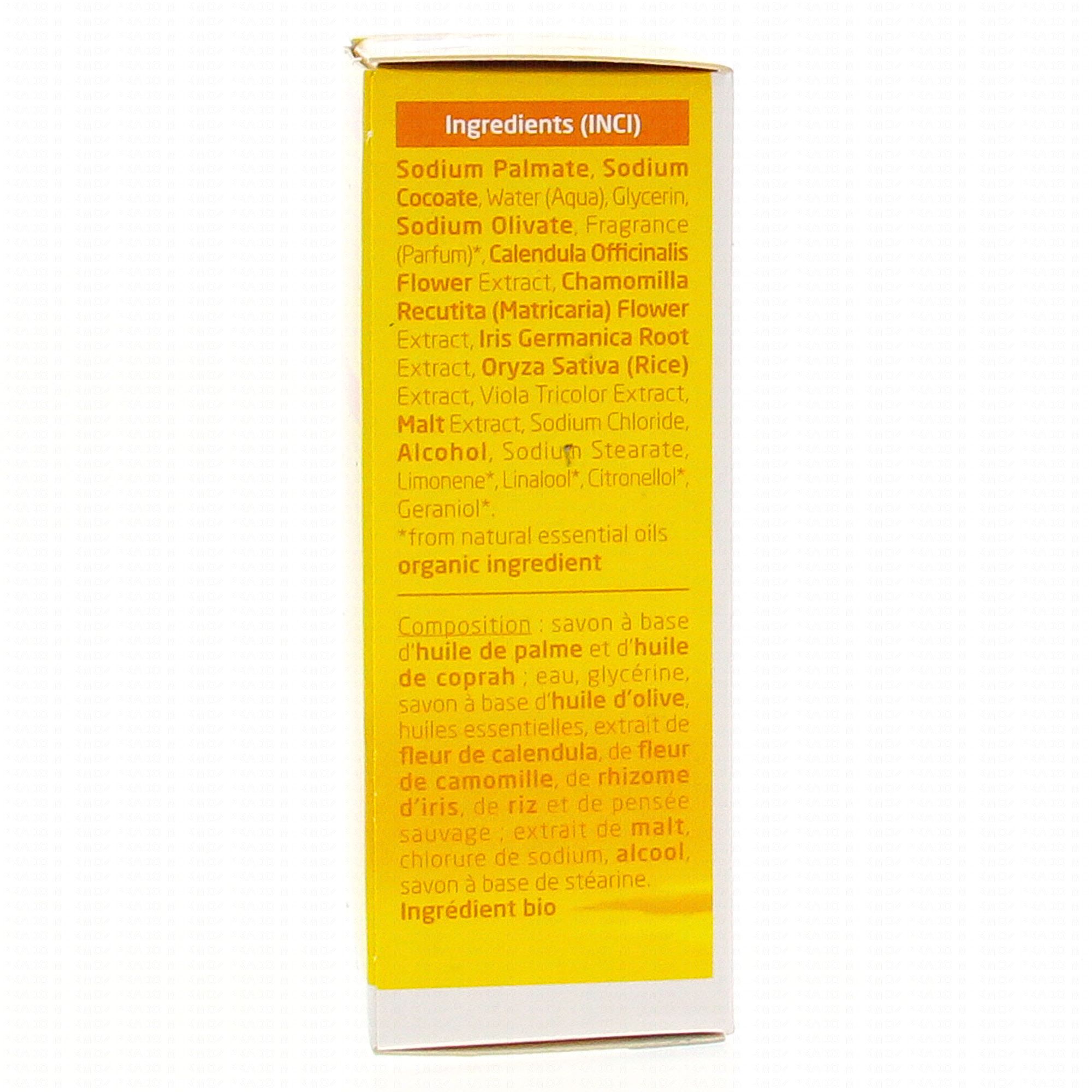 Formule INCI : sodium palmate, sodium cocoate, Aqua, sodium olivate, glycerin, fragance, limonene, linalool, citronellol, geraniol, Calendula officinalis, Chamomilla recutita, Iris germinica, Viola tricolor, Oriza sativa, malt extract, sodium chloride.