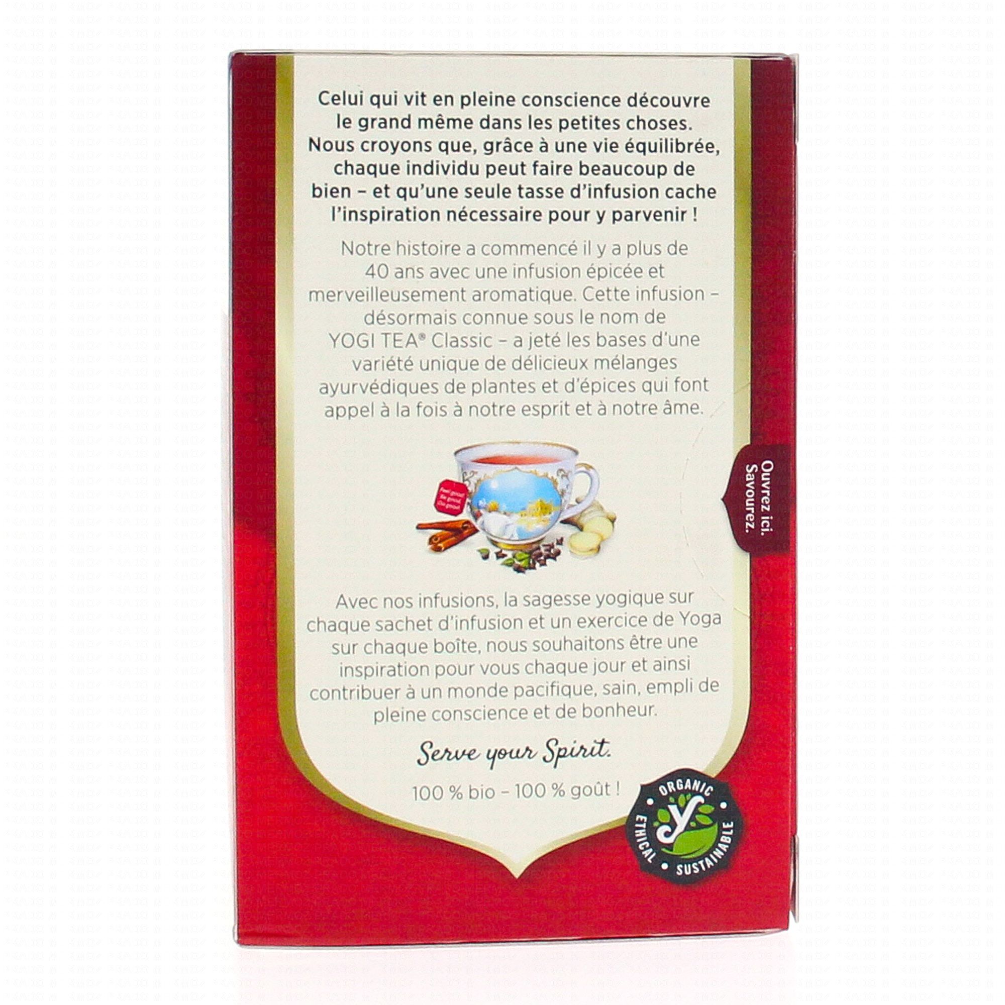 YOGI TEA Classic 17 sachets est une infusion associant le Gingembre, le Poivre noir, la Cannelle et la Cardamome.